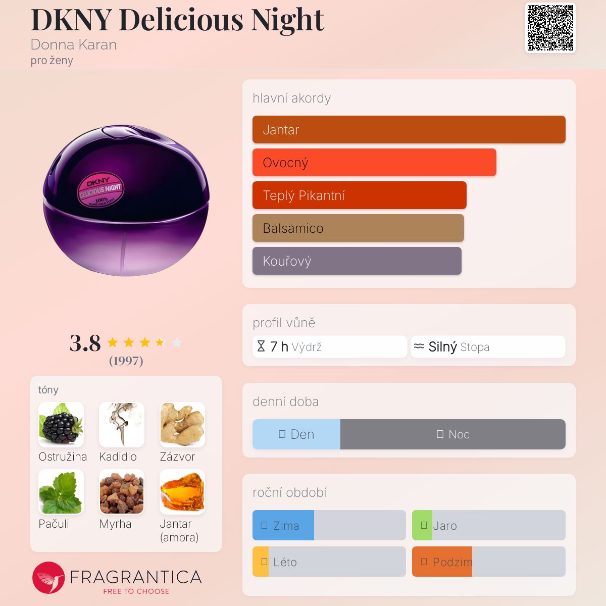 DKNY Delicious Night podle Donna Karan je Orientální Floral vůně pro ženy. DKNY Delicious Night byl/a uveden/a v roce 2008. "Nosem" za touto vůní je Jean-Marc Chaillan. Vrchní tóny jsou Ostružina, Zázvor, Pomelo a Frézie; střední tóny jsouOrchidej, Jasmín a Kosatec ; základní tóny jsou Kadidlo, Pačuli, Myrha, Jantar (ambra) a Vetiver.