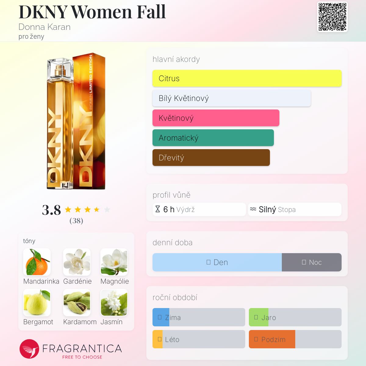 DKNY Women Fall podle Donna Karan je Floral Woody Musk vůně pro ženy. DKNY Women Fall byl/a uveden/a v roce 2013. Vrchní tóny jsou Mandarinka, Bergamot a Kardamom; střední tóny jsouGardénie, Magnólie a Jasmín ; základní tóny jsou Pižmo, Vetiver a Cedr.