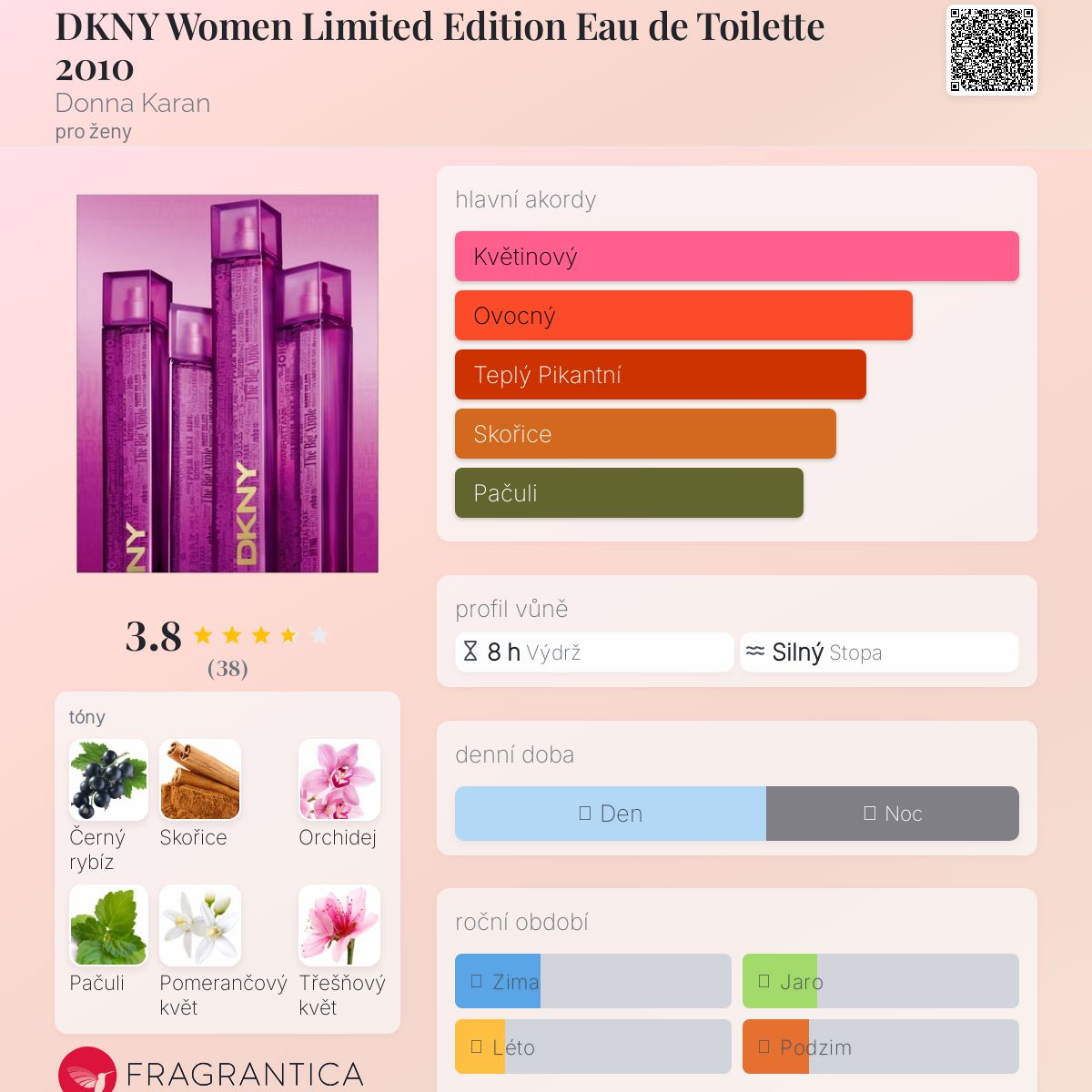 DKNY Women Limited Edition Eau de Toilette 2010 podle Donna Karan je Floral vůně pro ženy. DKNY Women Limited Edition Eau de Toilette 2010 byl/a uveden/a v roce 2010. Vrchní tóny jsou Černý rybíz, Květ afrického pomeranče a Třešňový květ; střední tóny jsouOrchidej, Frézie a Vonokvětka ; základní tóny jsou Skořice, Pačuli a Pižmo.