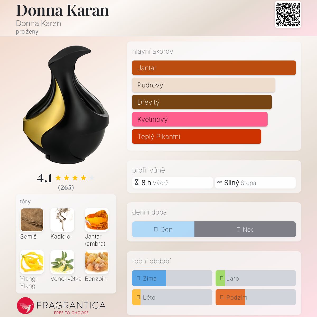 Donna Karan podle Donna Karan je Floral vůně pro ženy. Donna Karan byl/a uveden/a v roce 1992. "Nosem" za touto vůní je IFF. Vrchní tóny jsou Vonokvětka, Pomerančový květ, Meruňka, Ananas, Broskev, Bergamot a Zelené tóny; střední tóny jsouYlang-Ylang, Karafiát, Otočník, Lilie, Orchidej, Jasmín, Růže a Kasie ; základní tóny jsou Semiš, Kadidlo, Jantar (ambra), Benzoin, Fazole tonka, Santalové dřevo, Pižmo, Pačuli, Vanilka, Vetiver, Cedr a Citrusy.