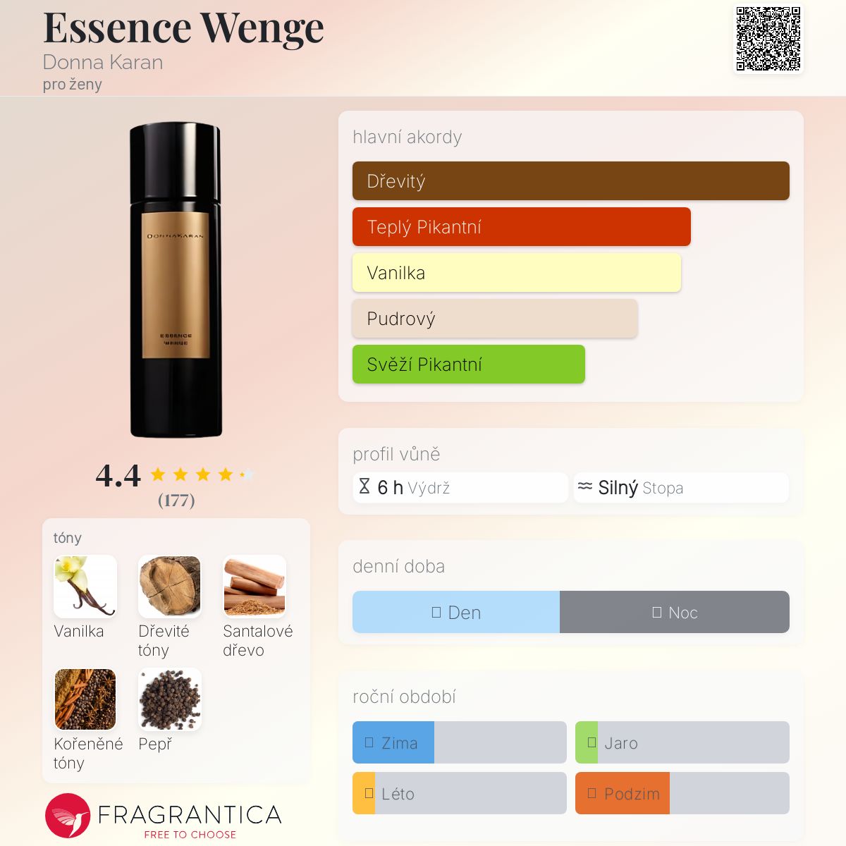 Essence Wenge podle Donna Karan je Woody vůně pro ženy. Essence Wenge byl/a uveden/a v roce 2008. "Nosem" za touto vůní je Rodrigo Flores-Roux. Vrchní tón je Temné dřevité tóny ; střední tóny jsouVanilka, Santalové dřevo a Černý pepř ; základní tón je Kořeněné tóny.
