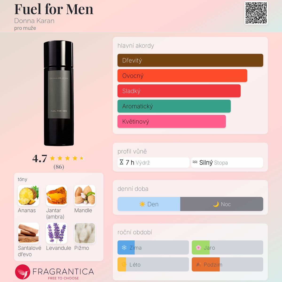 Fuel for Men podle Donna Karan je Woody Floral Musk vůně pro muže. Fuel for Men byl/a uveden/a v roce 2008. Vrchní tóny jsou Ananas, Citrusy a Jalovec; střední tóny jsouJantar (ambra), Mandle, Levandule a Květinové tóny ; základní tóny jsou Santalové dřevo, Pižmo a Pačuli.
