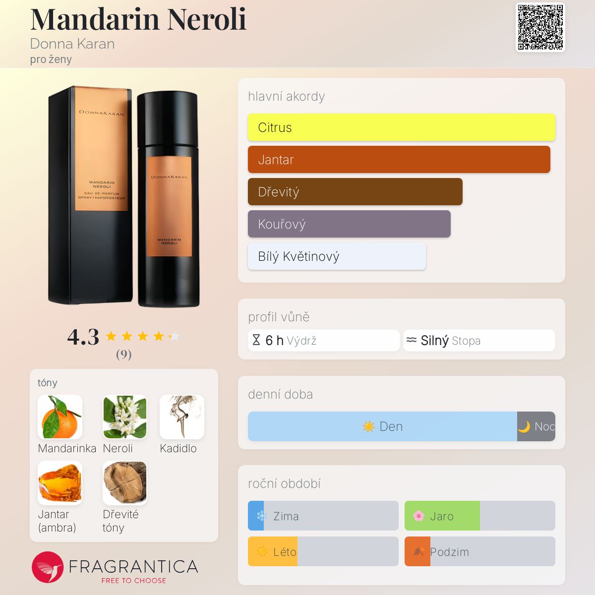 Mandarin Neroli podle Donna Karan je Orientální Floral vůně pro ženy. Mandarin Neroli byl/a uveden/a v roce 2012. Vrchní tón je Mandarinka ; střední tón jeNeroli ; základní tóny jsou Kadidlo, Jantar (ambra) a Dřevité tóny.