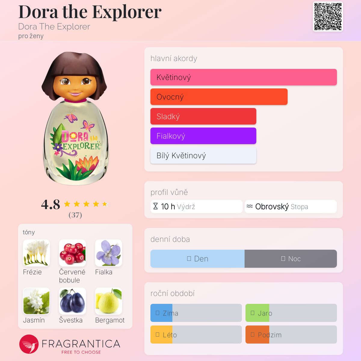 Dora the Explorer podle Dora The Explorer je Floral Fruity vůně pro ženy. Vrchní tóny jsou Červené bobule, Vodní fialka a Bergamot; střední tóny jsouFrézie, Jasmín a Švestka ; základní tóny jsou Santalové dřevo, Pižmo a Jantar (ambra).