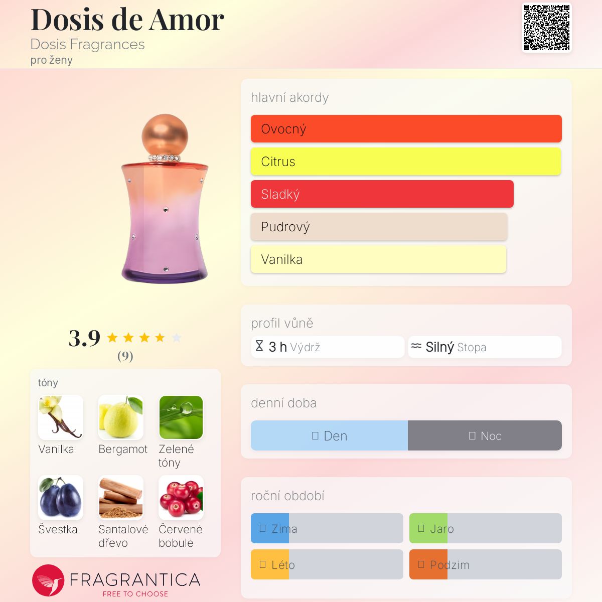 Dosis de Amor podle Dosis Fragrances je Floral Fruity vůně pro ženy. Vrchní tóny jsou Bergamot a Zelené listí; střední tóny jsouŠvestka, Červené bobule a Mandarinka ; základní tóny jsou Vanilka, Santalové dřevo a Pižmo.