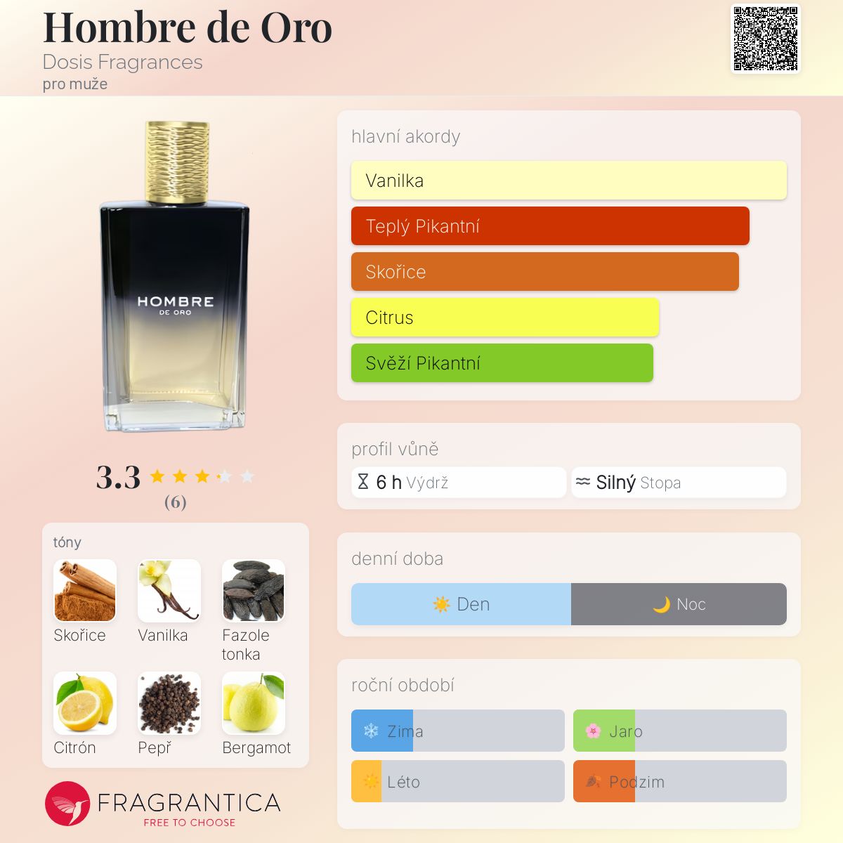 Hombre de Oro podle Dosis Fragrances je Aromatic Spicy vůně pro muže. Vrchní tóny jsou Citrón, Černý pepř a Bergamot; střední tóny jsouSkořice a Cypřiš ; základní tóny jsou Vanilka, Fazole tonka, Cedr a Pižmo.