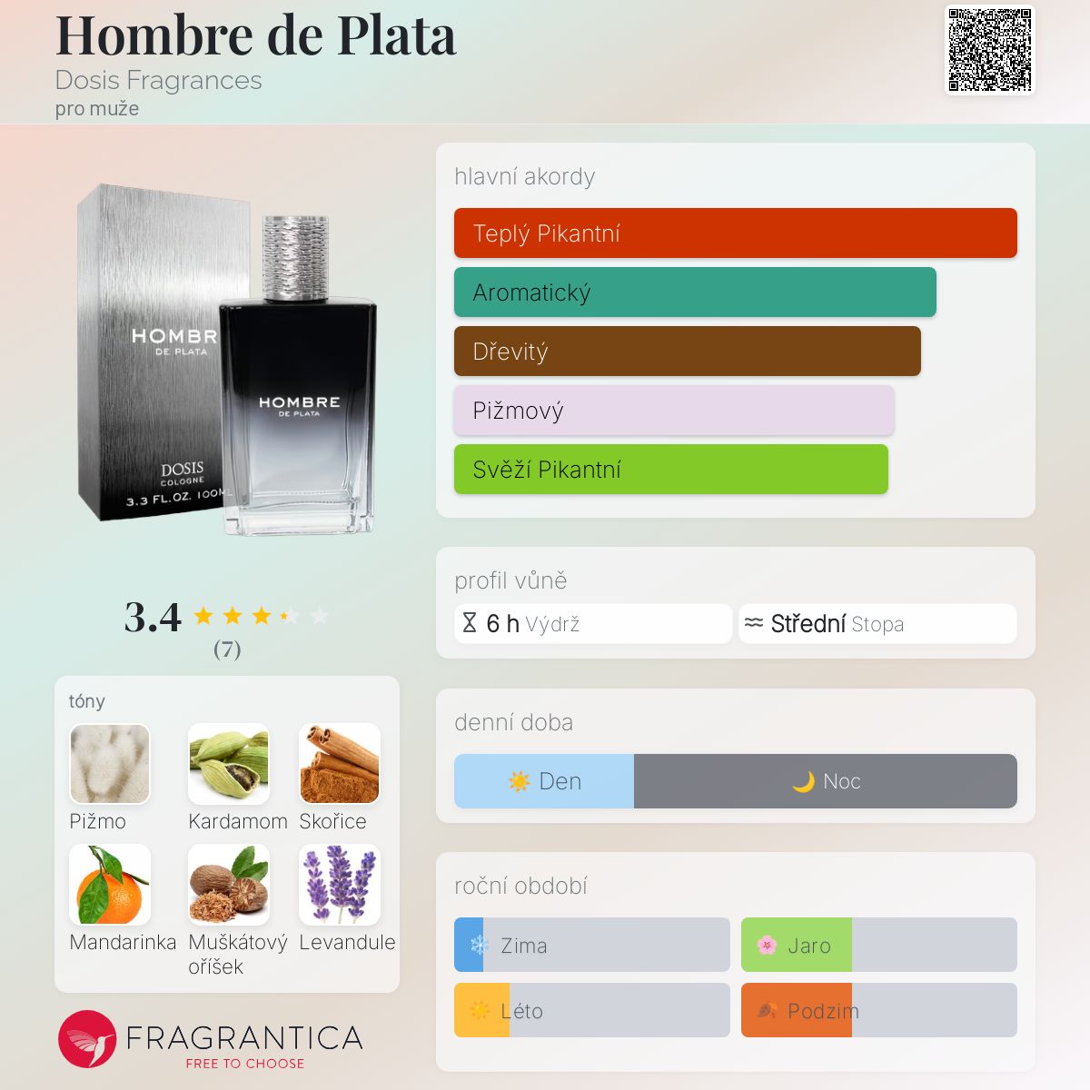 Hombre de Plata podle Dosis Fragrances je Aromatic Fougere vůně pro muže. Vrchní tóny jsou Mandarinka a Bergamot; střední tóny jsouKardamom, Skořice, Muškátový oříšek, Levandule a Cypřiš ; základní tóny jsou Pižmo, Fazole tonka, Cedr, Pačuli a Jantar (ambra).