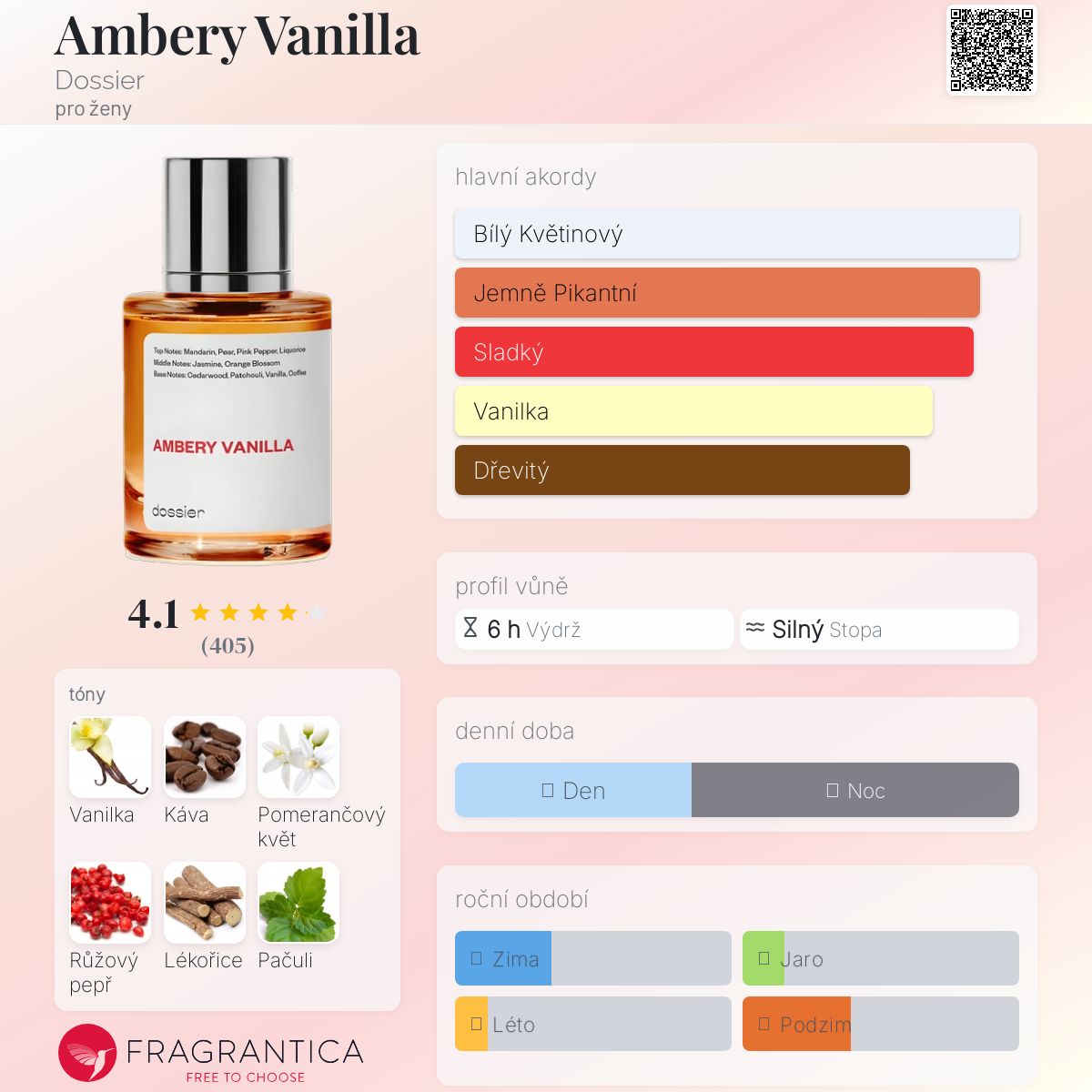 Ambery Vanilla podle Dossier je Orientální Vanilla vůně pro ženy. Ambery Vanilla byl/a uveden/a v roce 2022. Vrchní tóny jsou Růžový pepř, Lékořice, Hruška a Mandarinka; střední tóny jsouPomerančový květ a Jasmín ; základní tóny jsou Vanilka, Káva, Pačuli a Cedr.