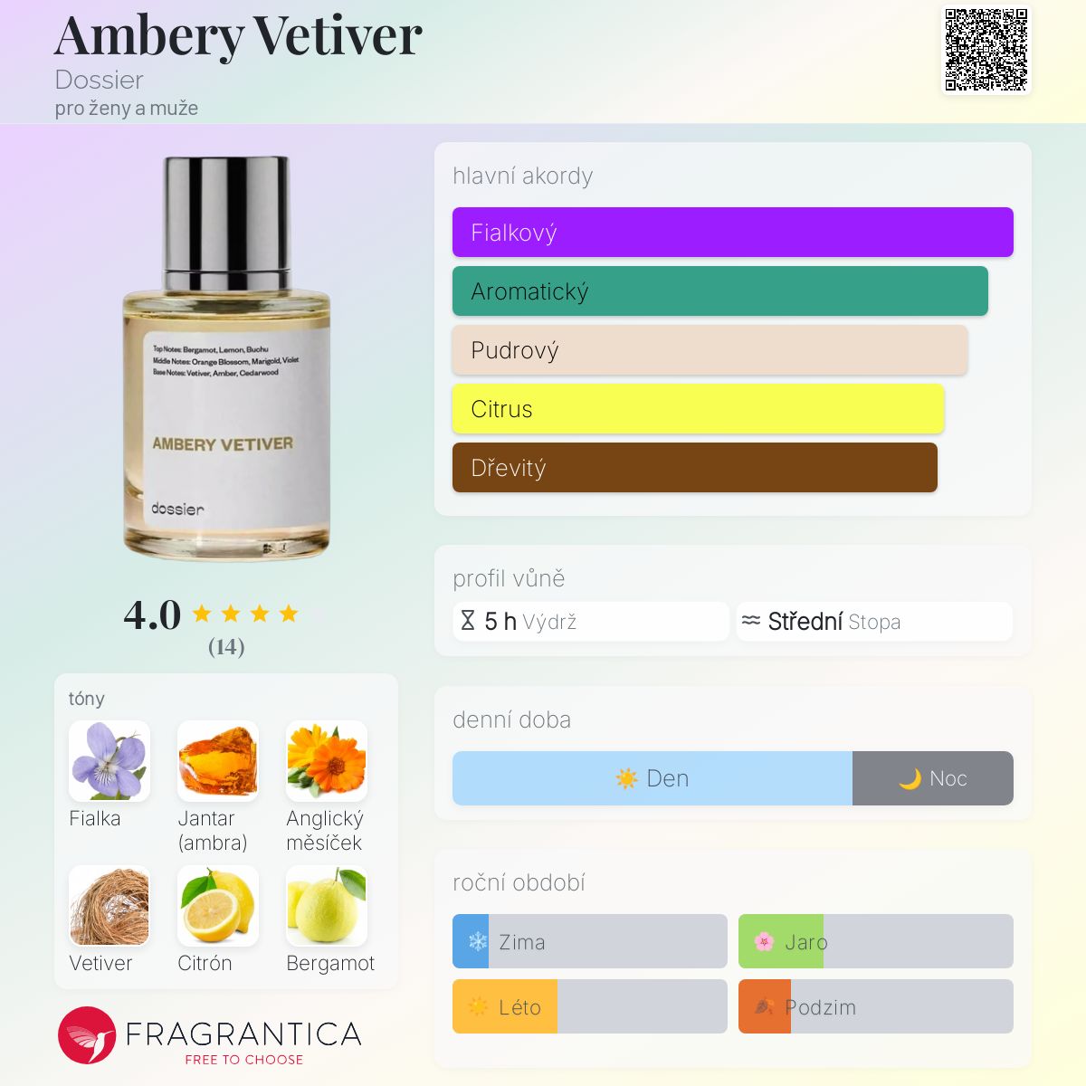 Ambery Vetiver podle Dossier je vůně pro ženy a muže. Ambery Vetiver byl/a uveden/a v roce 2021. Vrchní tóny jsou Citrón a Bergamot; střední tóny jsouFialka, Měsíček a Pomerančový květ ; základní tóny jsou Jantar (ambra), Vetiver a Cedr.