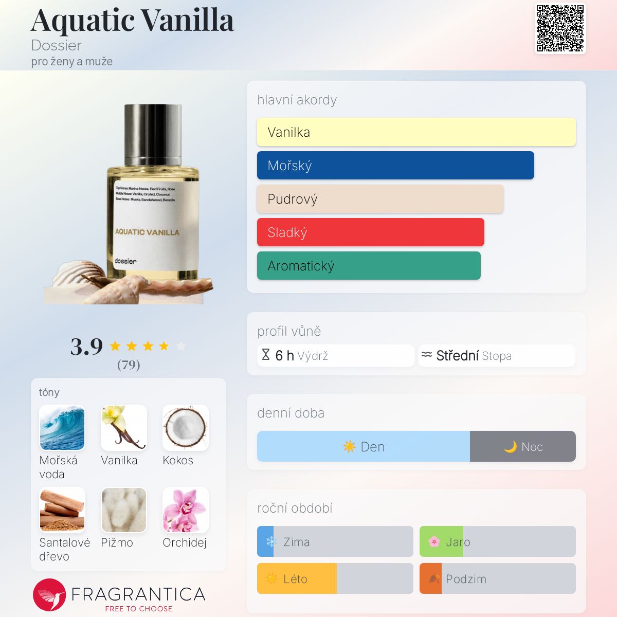 Aquatic Vanilla podle Dossier je Orientální Vanilla vůně pro ženy a muže. Toto je nová vůně. Aquatic Vanilla byl/a uveden/a v roce 2024. Vrchní tóny jsou Mořské tóny, Červené ovoce a Růže; střední tóny jsouVanilka, Kokos a Orchidej ; základní tóny jsou Santalové dřevo, Pižmo a Benzoin.