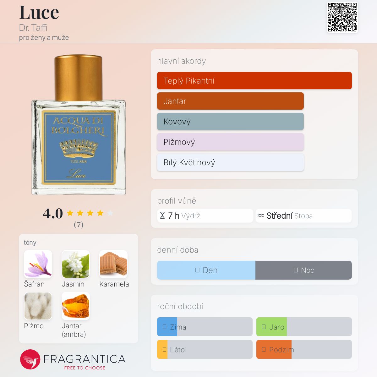 Luce podle Dr. Taffi je vůně pro ženy a muže. Toto je nová vůně. Luce byl/a uveden/a v roce 2024. Vrchní tón je Šafrán ; střední tóny jsouJasmín a Karamela ; základní tóny jsou Bílé pižmo a Jantar (ambra).