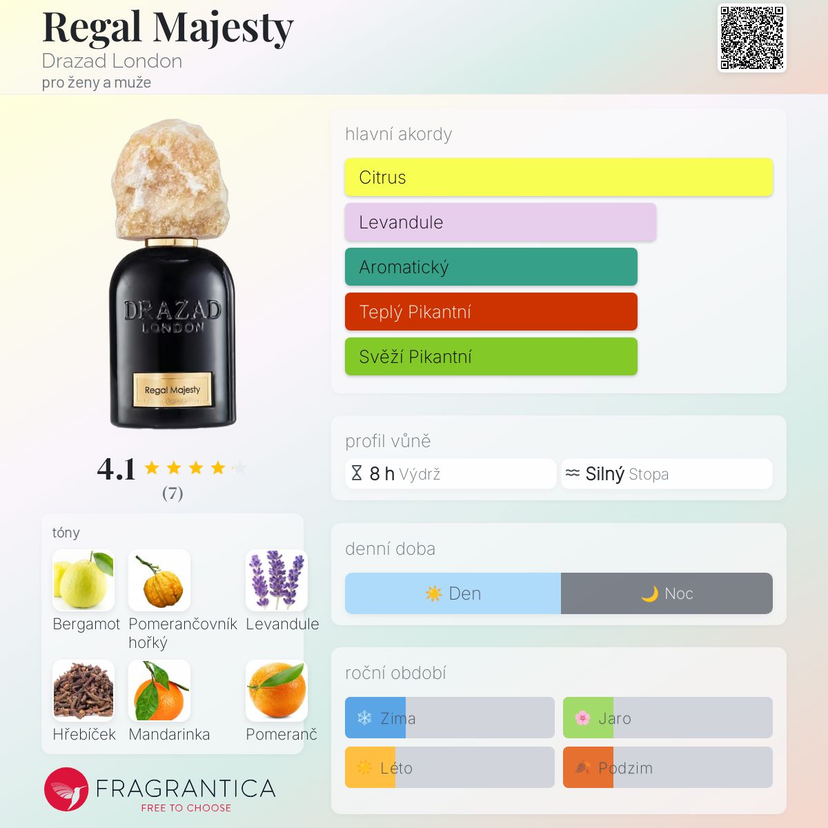 Regal Majesty podle Drazad London je Orientální Floral vůně pro ženy a muže. Toto je nová vůně. Regal Majesty byl/a uveden/a v roce 2025. Vrchní tóny jsou Bergamot, Pomerančovník hořký, Mandarinka a Pomeranč; střední tóny jsouLevandule, Hřebíček, Pomerančový květ a Jasmín ; základní tóny jsou Santalové dřevo, Fazole tonka, Cedr, Vanilka a Jantar (ambra).
