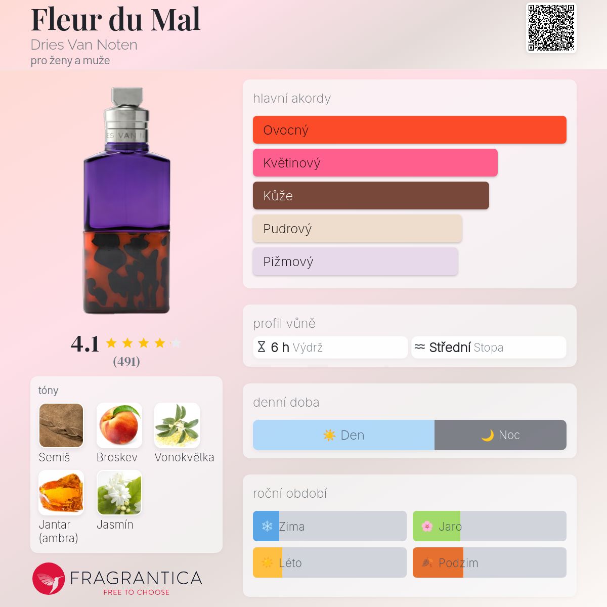 Fleur du Mal podle Dries Van Noten je Floral vůně pro ženy a muže. Toto je nová vůně. Fleur du Mal byl/a uveden/a v roce 2022. "Nosem" za touto vůní je Quentin Bisch. Vrchní tón je Broskev ; střední tóny jsouVonokvětka a Jasmín ; základní tóny jsou Semiš a Jantar (ambra).