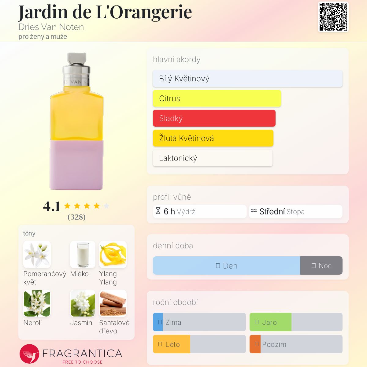 Jardin de L'Orangerie podle Dries Van Noten je Floral Woody Musk vůně pro ženy a muže. Jardin de L'Orangerie byl/a uveden/a v roce 2022. "Nosem" za touto vůní je Daniela Andrier. Vrchní tón je Neroli ; střední tóny jsouYlang-Ylang a Jasmín ; základní tóny jsou Pomerančový květ, Mléko a Santalové dřevo.
