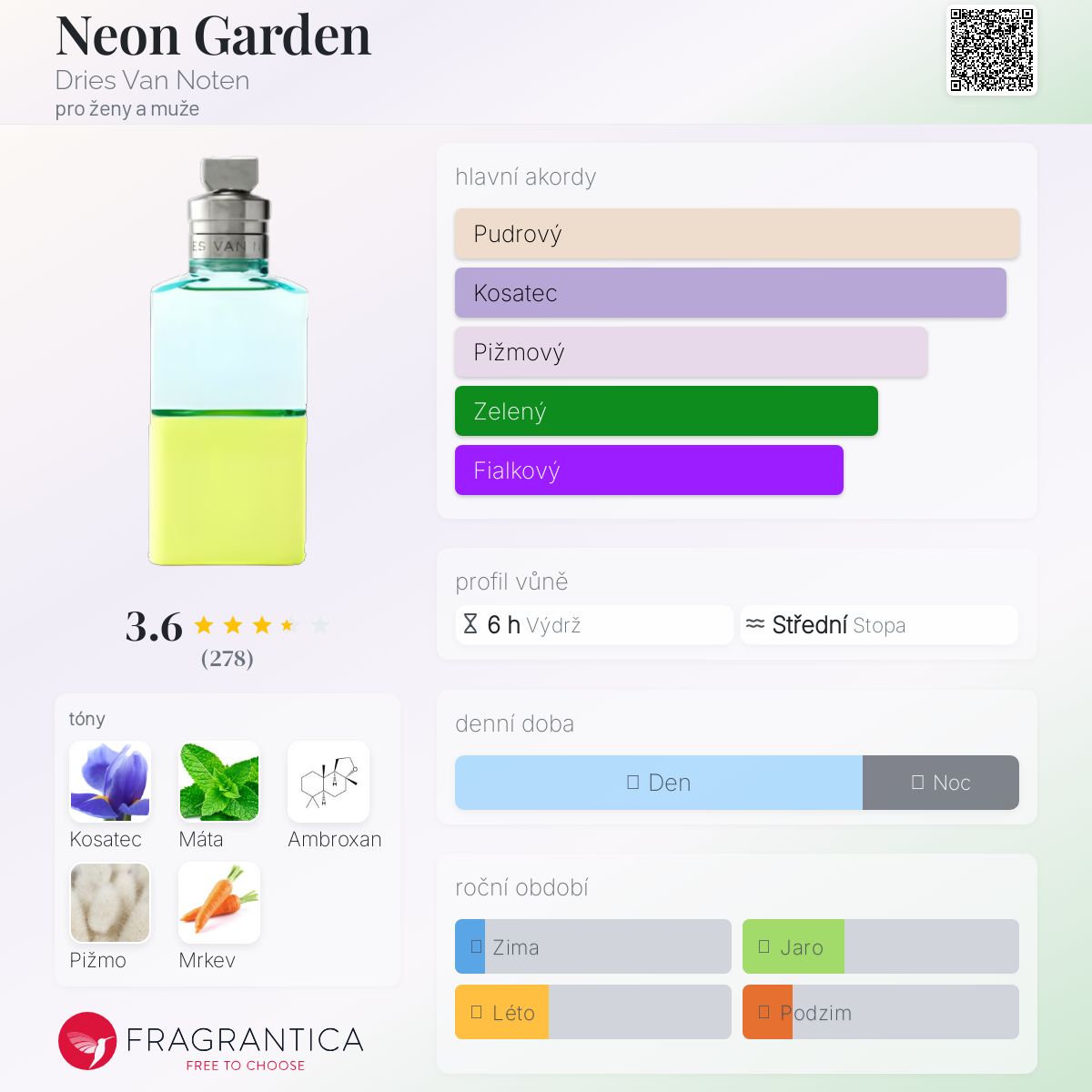 Neon Garden podle Dries Van Noten je Aromatic vůně pro ženy a muže. Neon Garden byl/a uveden/a v roce 2022. "Nosem" za touto vůní je Fanny Bal. Vrchní tón je Máta ; střední tóny jsouKosatec a Mrkev ; základní tóny jsou Ambroxan a Pižmo.