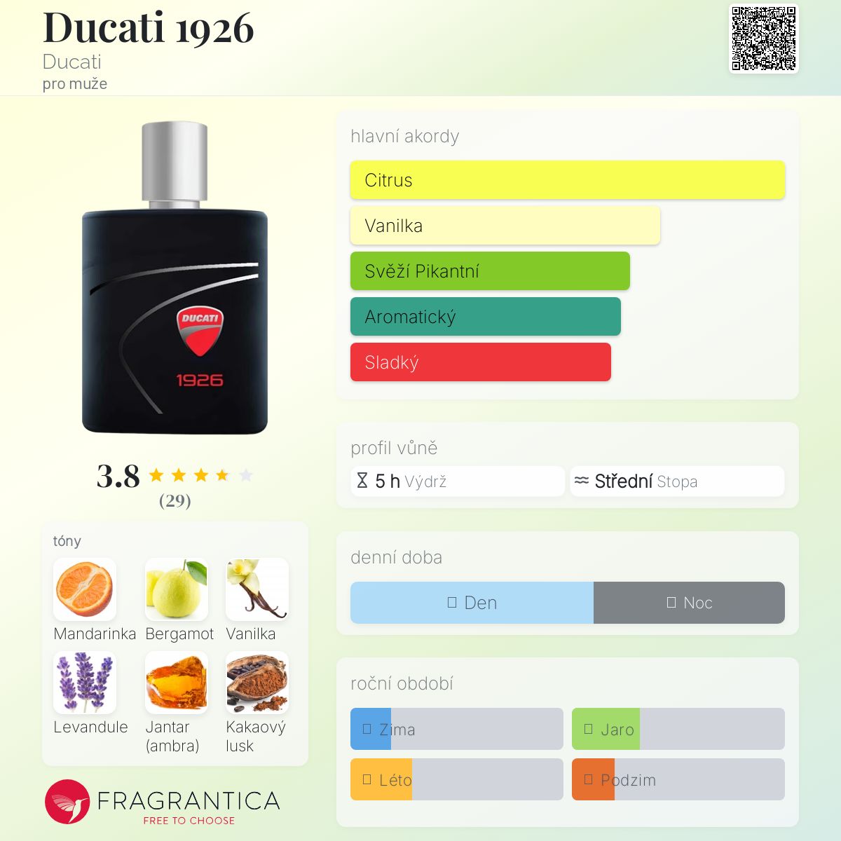 Ducati 1926 podle Ducati je Aromatic Fougere vůně pro muže. Ducati 1926 byl/a uveden/a v roce 2017. Vrchní tóny jsou Mandarinka a Bergamot; střední tóny jsouLevandule, Kakao a Pelargónie ; základní tóny jsou Vanilka, Jantar (ambra), Cedr a Fazole tonka.