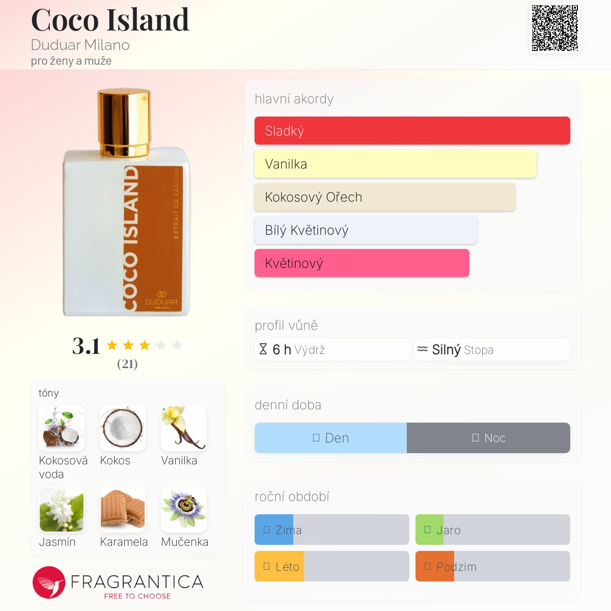 Coco Island podle Duduar Milano je Orientální Vanilla vůně pro ženy a muže. Toto je nová vůně. Coco Island byl/a uveden/a v roce 2025. "Nosem" za touto vůní je Sofia Bardelli. Vrchní tóny jsou Karamela, Mučenka a Růžový pepř; střední tóny jsouKokosová voda, Kokos a Jasmín ; základní tóny jsou Vanilka, Pižmo a Cedr.