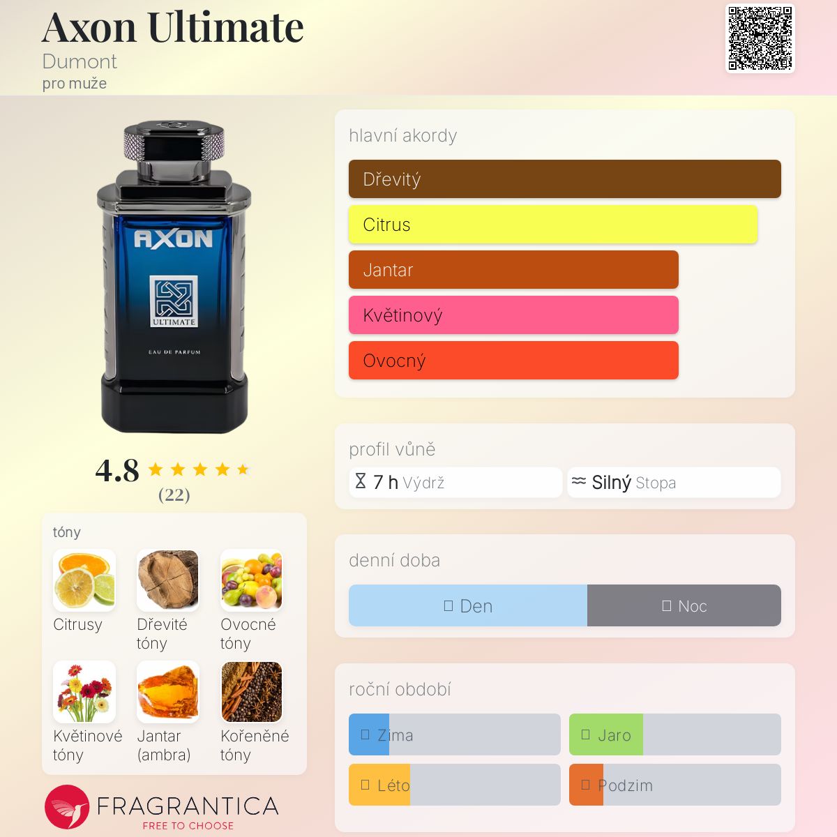 Axon Ultimate podle Dumont je Woody Aromatic vůně pro muže. Toto je nová vůně. Axon Ultimate byl/a uveden/a v roce 2024. Vrchní tóny jsou Citrusy, Ovocné tóny a Kořeněné tóny; střední tóny jsouDřevité tóny, Ovocné tóny a Květinové tóny ; základní tóny jsou Květinové tóny, Jantar (ambra) a Dubový mech.