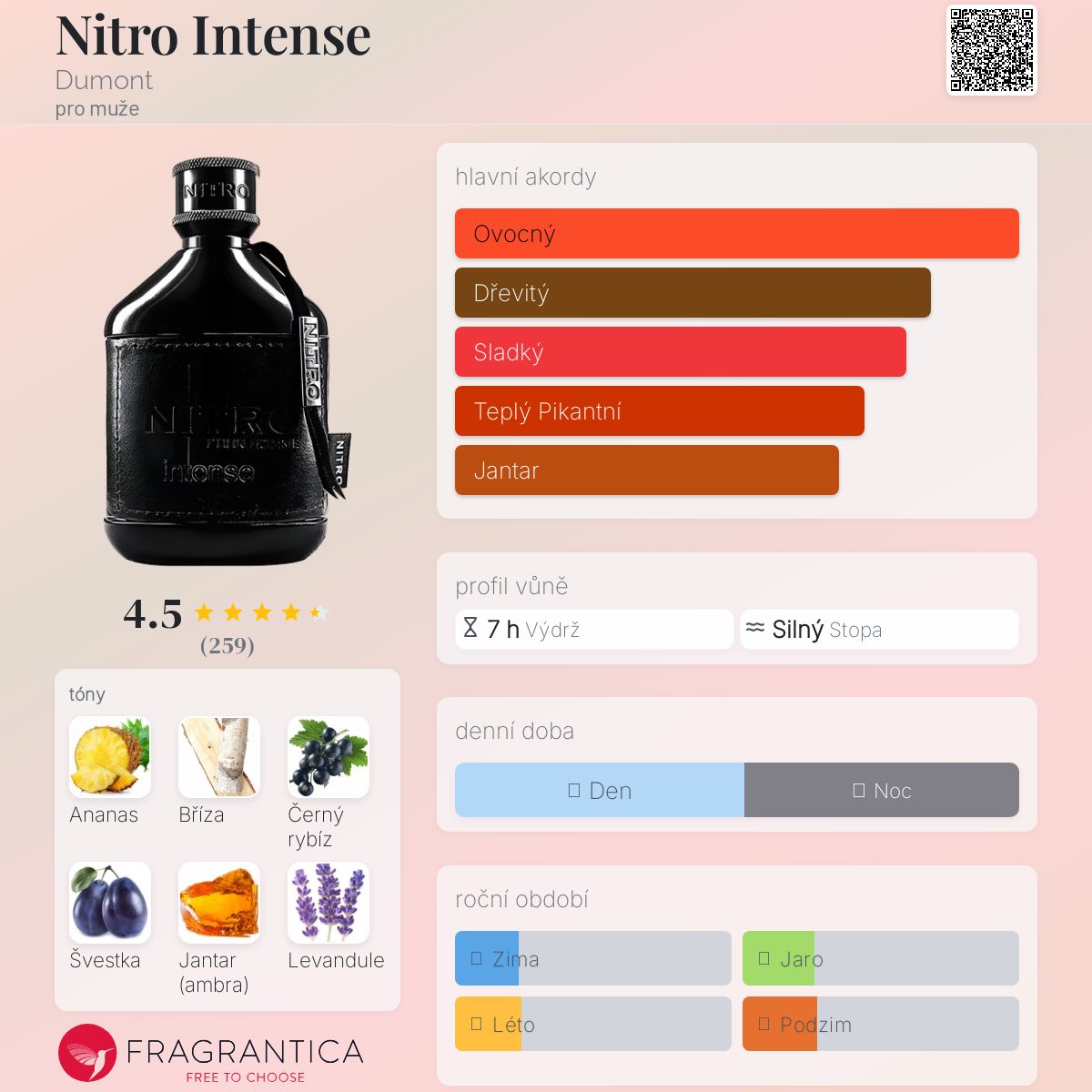 Nitro Intense podle Dumont je Orientální Woody vůně pro muže. Nitro Intense byl/a uveden/a v roce 2023. Vrchní tóny jsou Ananas, Černý rybíz, Švestka, Bergamot, Skořice a Koňak; střední tóny jsouBříza, Levandule, Pačuli, Myrha, Pepř, Jasmín, Kosatec a Růže ; základní tóny jsou Jantar (ambra), Santalové dřevo, Pižmo, Vanilka a Fazole tonka.