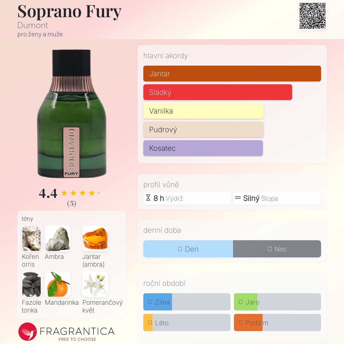 Soprano Fury podle Dumont je vůně pro ženy a muže. Soprano Fury byl/a uveden/a v roce 2025. Soprano Fury byl/a vytvořen/a Belén García a Christian Provenzano. Vrchní tóny jsou Mandarinka, Karamel, Švestka, Kokos, Mléko a Bergamot; střední tóny jsouOrris, Pomerančový květ, Hnědý cukr, Cedr a Pižmo ; základní tóny jsou Ambra, Jantar (ambra), Fazole tonka a Vanilka.
