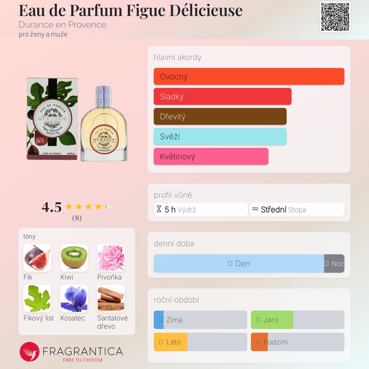 Eau de Parfum Figue Délicieuse podle Durance en Provence je vůně pro ženy a muže. Vrchní tóny jsou Fík, Kiwi a Fíkový list; střední tóny jsouPivoňka, Kosatec a Ostružina ; základní tóny jsou Fík, Santalové dřevo, Mléko a Švestka.