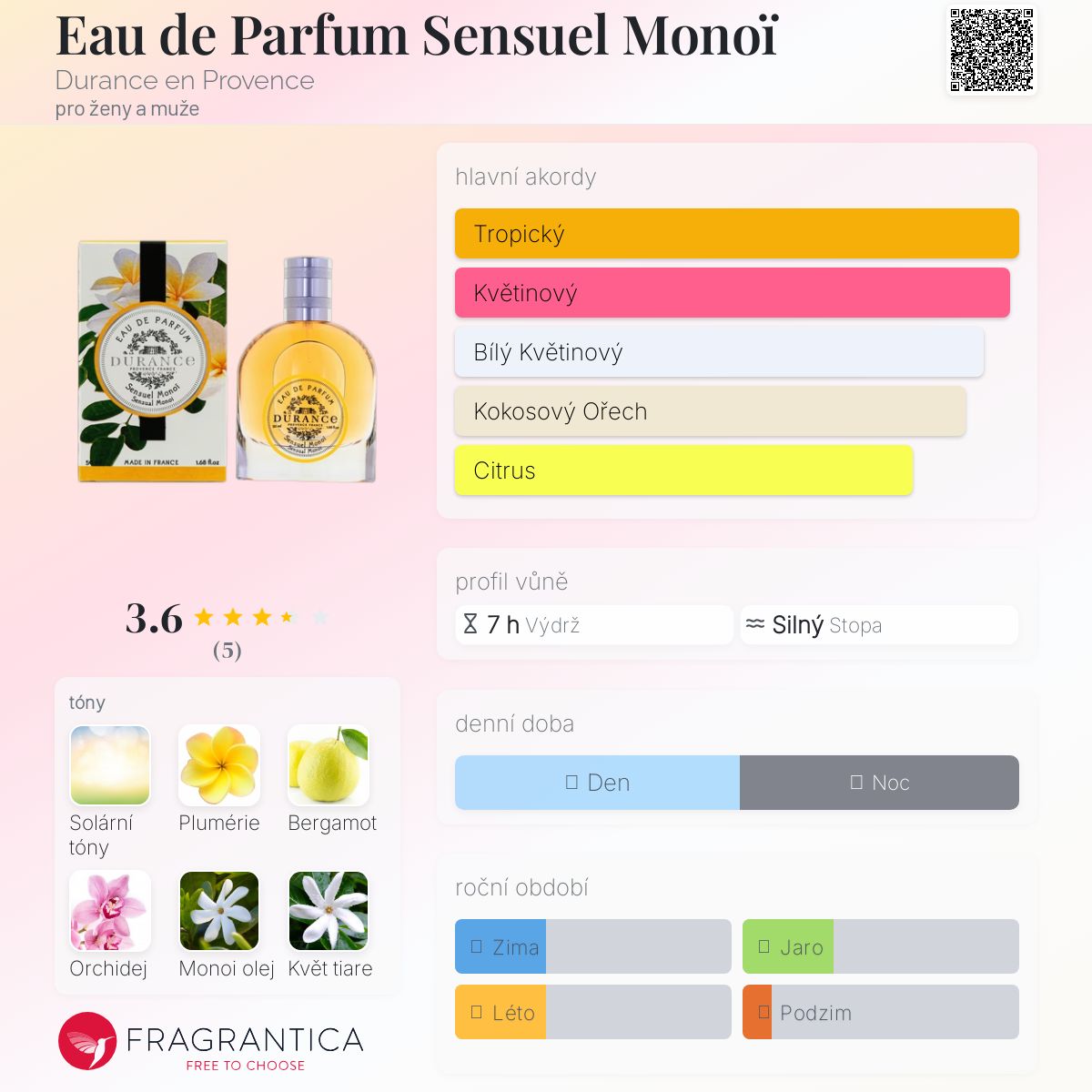 Eau de Parfum Sensuel Monoï podle Durance en Provence je vůně pro ženy a muže. Vrchní tóny jsou Solární tóny, Plumérie a Bergamot; střední tóny jsouOrchidej, Monoi olej a Květ tiare ; základní tóny jsou Kokosové mléko, Santalové dřevo a Vanilka.