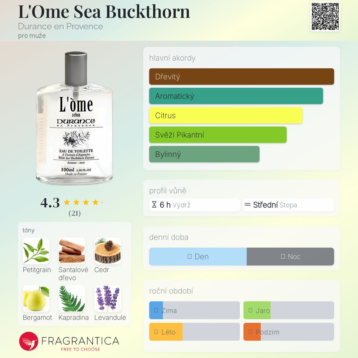 L'Ome Sea Buckthorn podle Durance en Provence je Woody Aromatic vůně pro muže. L'Ome Sea Buckthorn byl/a uveden/a v roce 2006. Vrchní tóny jsou Bergamot, Pelyněk a Citrón; střední tóny jsouKapradina a Levandule ; základní tóny jsou Petitgrain, Santalové dřevo a Cedr.