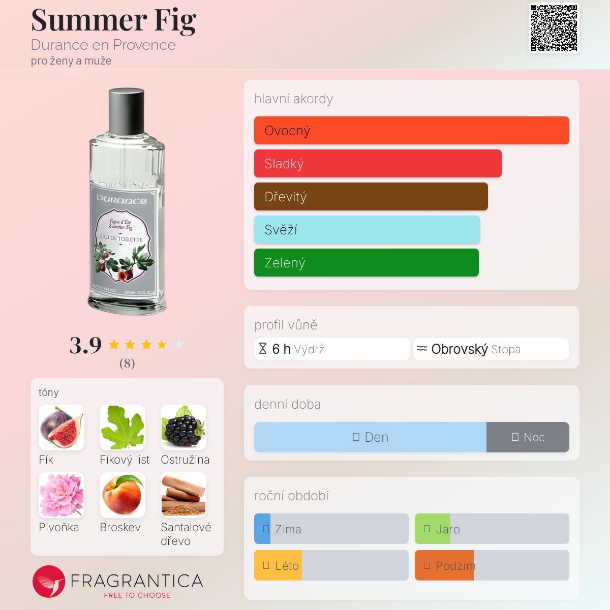 Summer Fig podle Durance en Provence je vůně pro ženy a muže. Vrchní tóny jsou Fíkový list, Pelyněk, Pomeranč a Kiwi; střední tóny jsouFík, Ostružina, Pivoňka, Broskev, Růže a Kosatec ; základní tóny jsou Fík, Santalové dřevo, Švestka, Cedr a Pižmo.