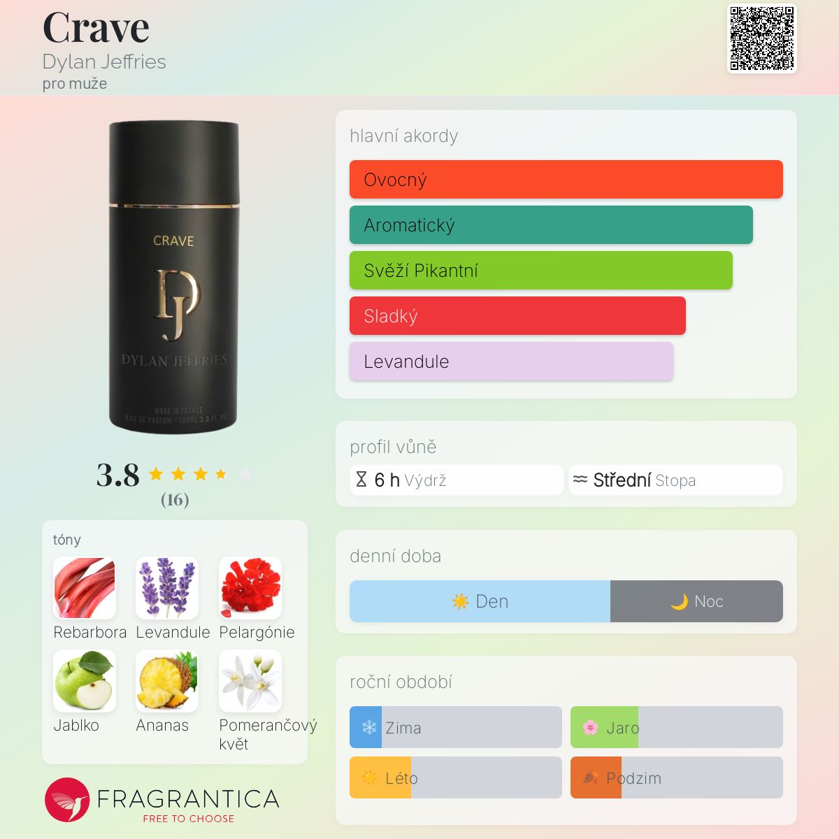 Crave podle Dylan Jeffries je Orientální Fougere vůně pro muže. Toto je nová vůně. Crave byl/a uveden/a v roce 2024. "Nosem" za touto vůní je Vincent Ricord. Vrchní tóny jsou Rebarbora, Jablko, Ananas, Citrón a Fíkovník; střední tóny jsouLevandule, Pelargónie, Pomerančový květ, Kosatec a Cedr ; základní tóny jsou Jantar (ambra), Pačuli, Vetiver a Kůže.