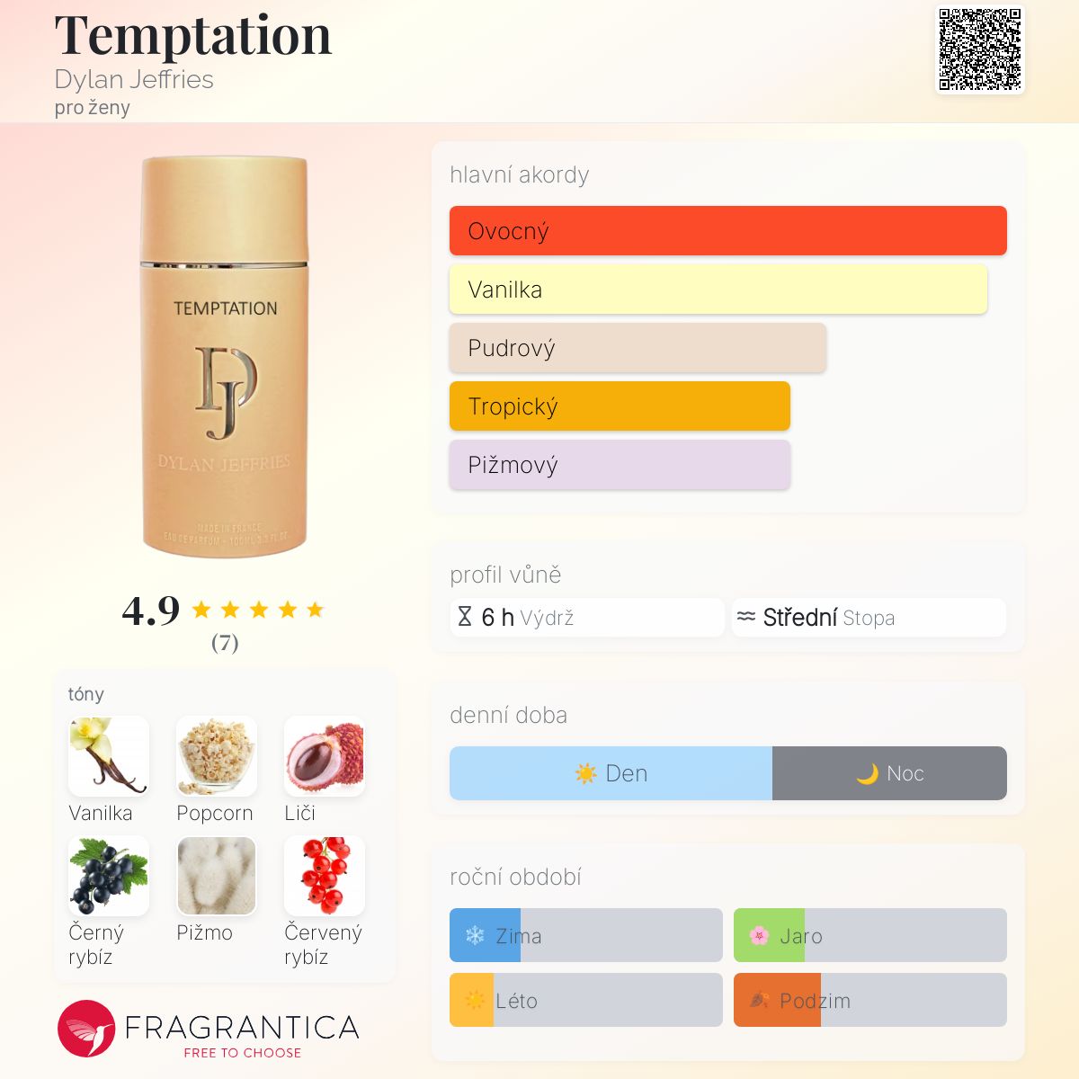 Temptation podle Dylan Jeffries je Floral Fruity Gourmand vůně pro ženy. Toto je nová vůně. Temptation byl/a uveden/a v roce 2024. "Nosem" za touto vůní je Vincent Ricord. Vrchní tóny jsou Liči, Černý rybíz a Červený rybíz; střední tóny jsouPopcorn, Růže a Jasmín ; základní tóny jsou Vanilka, Pižmo a Vetiver.