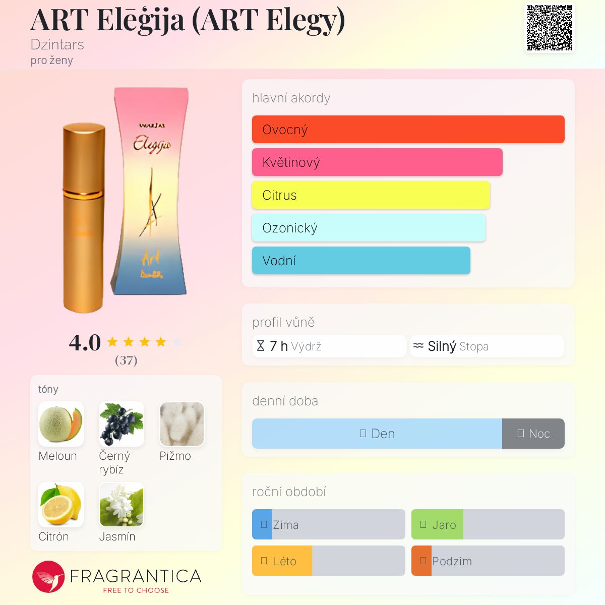 АRТ Elēģija (ART Elegy) podle Dzintars je Floral Fruity vůně pro ženy. АRТ Elēģija (ART Elegy) byl/a uveden/a v roce 2003. Vrchní tóny jsou Meloun a Citrón; střední tóny jsouČerný rybíz a Jasmín ; základní tón je Pižmo.