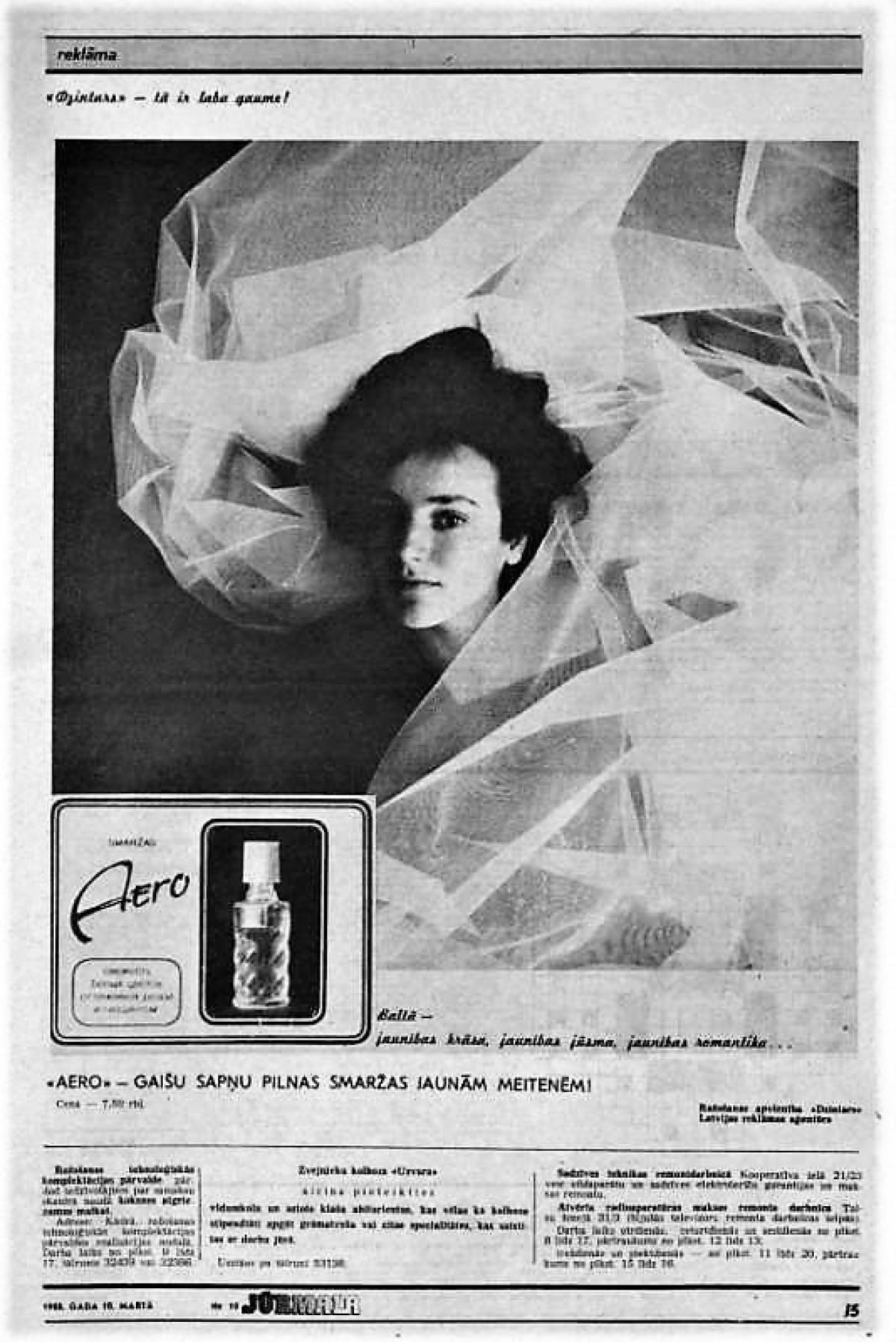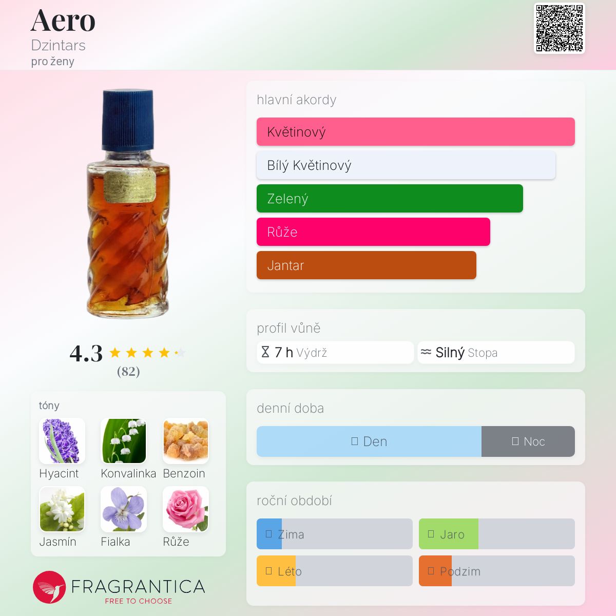Aero podle Dzintars je Floral vůně pro ženy. Aero byl/a uveden/a v roce 1987. Vrchní tóny jsou Hyacint, Konvalinka a Fialka; střední tóny jsouJasmín, Růže a Karafiát ; základní tóny jsou Benzoin, Pižmo a Vanilka.
