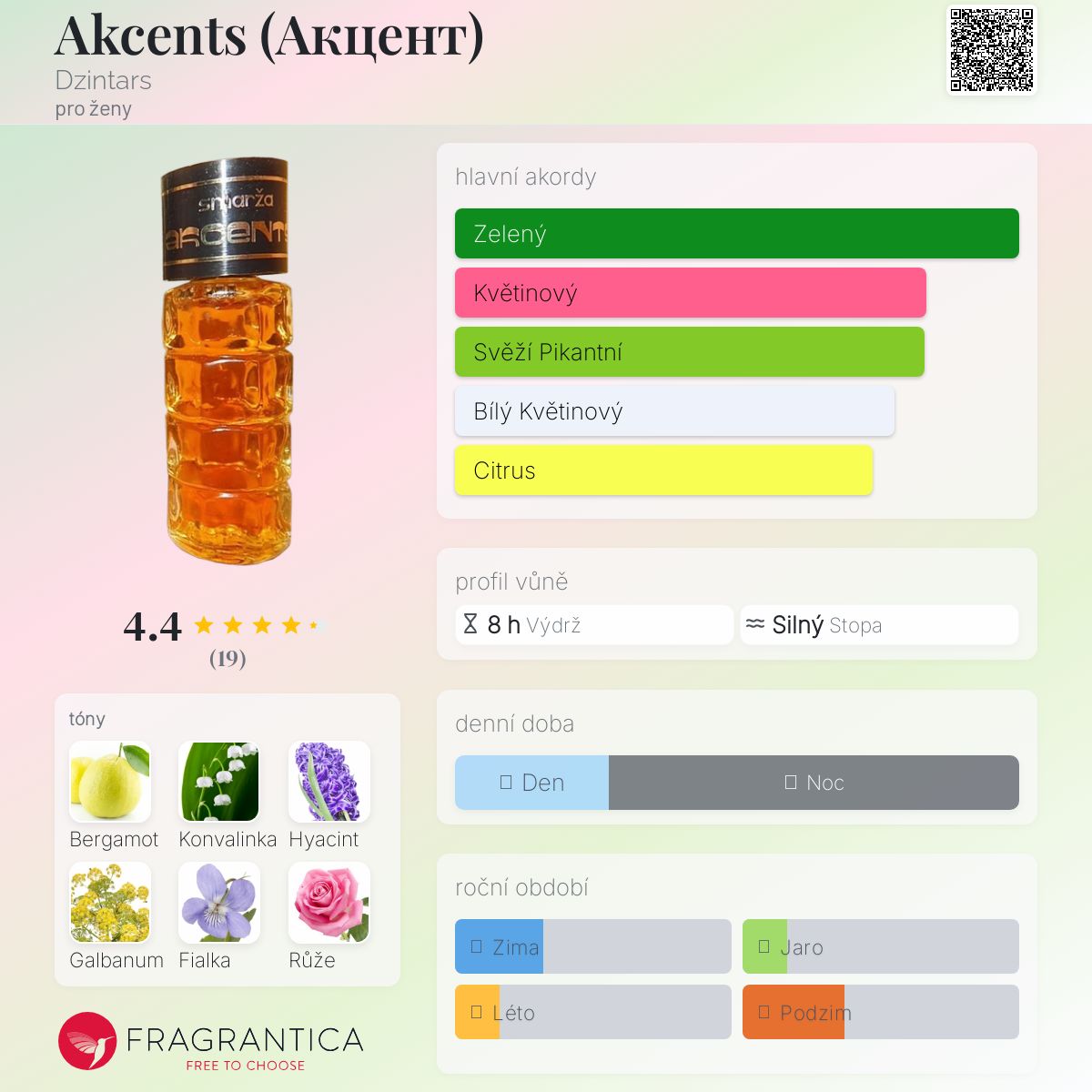 Akcents (Акцент) podle Dzintars je vůně pro ženy. Akcents (Акцент) byl/a uveden/a v roce 1985. "Nosem" za touto vůní je Antonina Vitkovskaya. Vrchní tóny jsou Bergamot, Konvalinka a Fialka; střední tóny jsouHyacint, Růže, Jasmín a Ylang-Ylang ; základní tóny jsou Galbanum, Pižmo a Pepř.