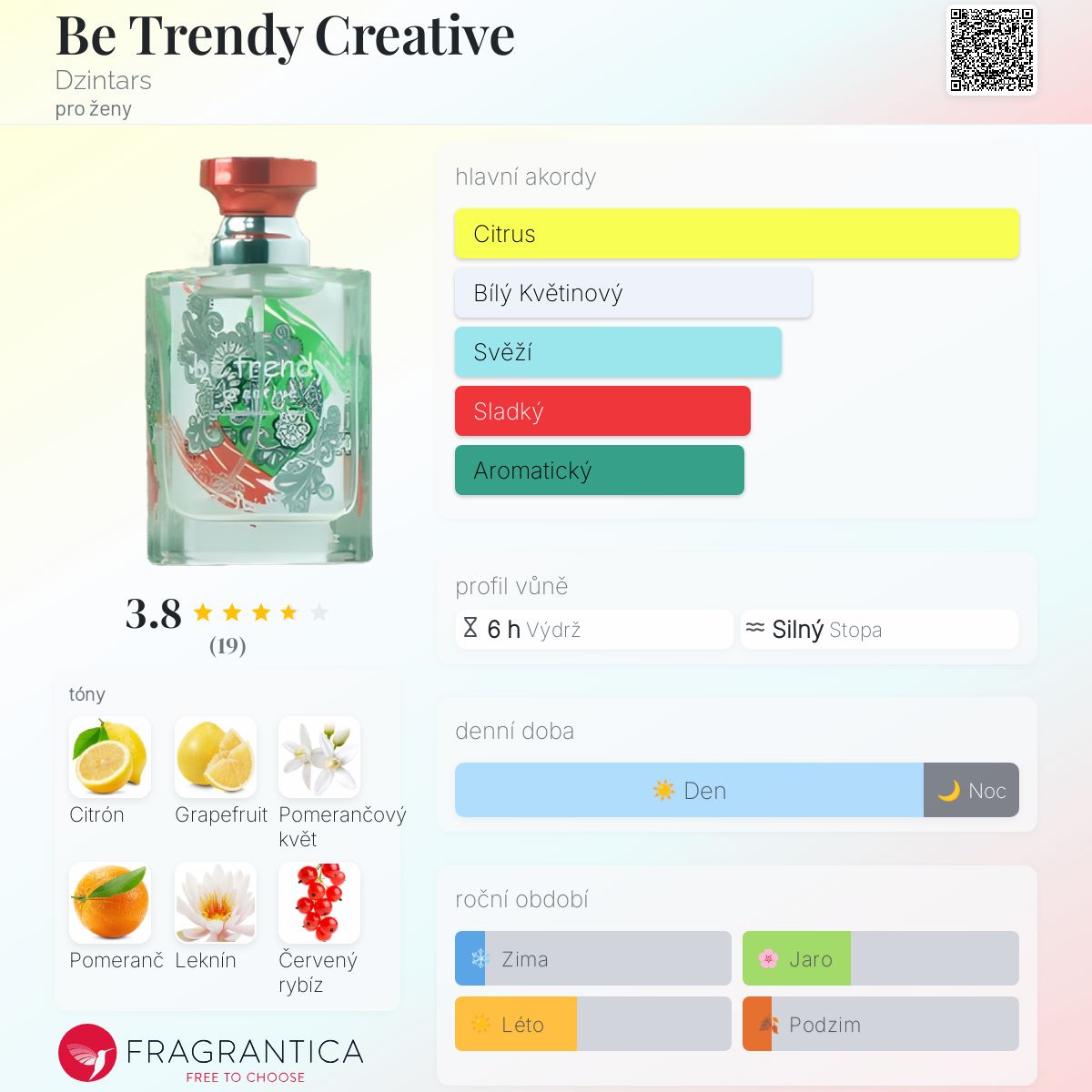 Be Trendy Creative podle Dzintars je Floral Fruity vůně pro ženy. Be Trendy Creative byl/a uveden/a v roce 2011. Vrchní tóny jsou Citrón, Růžový grapefruit, Pomeranč, Konvalinka a Broskev; střední tóny jsouPomerančový květ, Leknín a Červený rybíz ; základní tóny jsou Cedr, Kořen kosatce, Pižmo a Jantar (ambra).