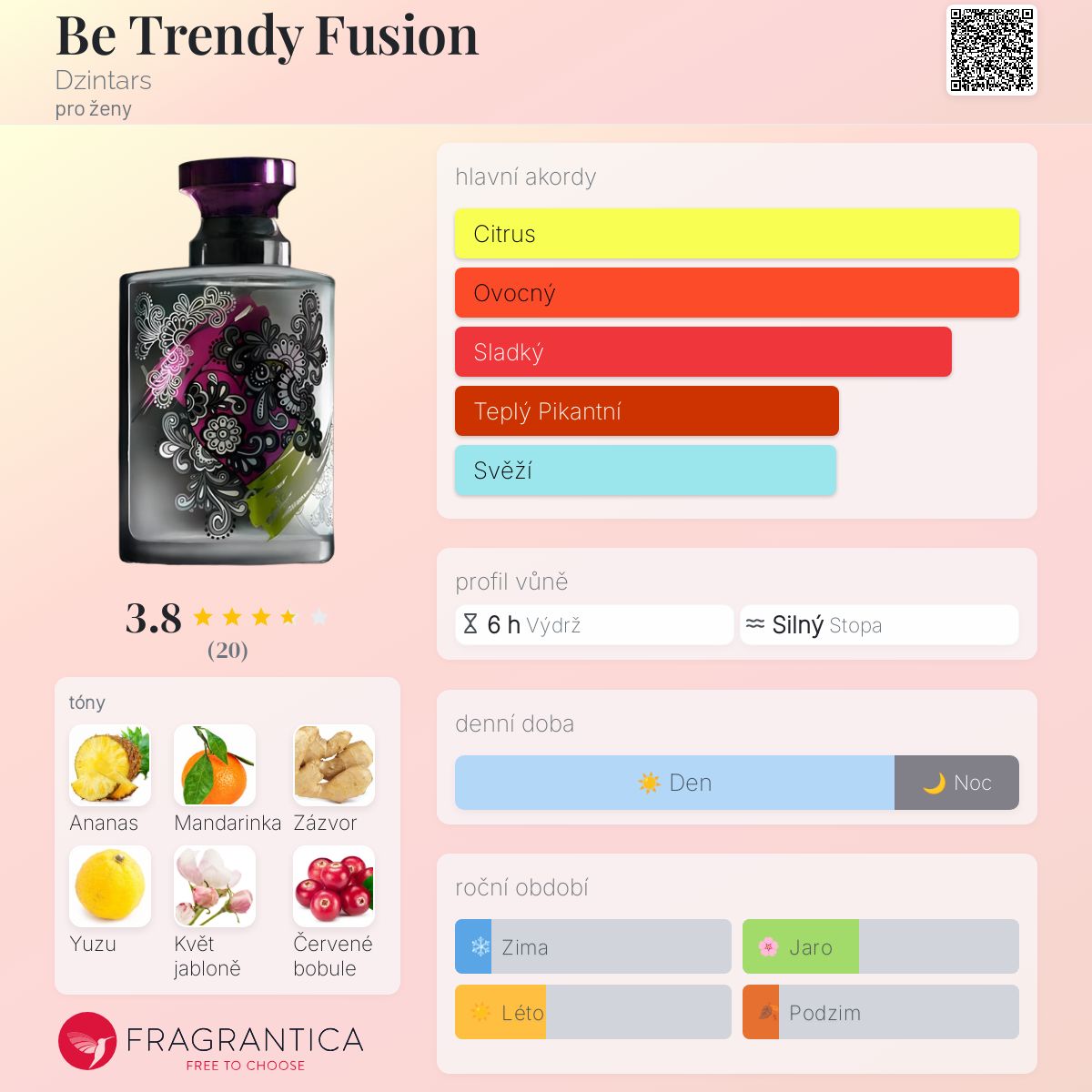 Be Trendy Fusion podle Dzintars je Floral Fruity Gourmand vůně pro ženy. Be Trendy Fusion byl/a uveden/a v roce 2011. Vrchní tóny jsou Ananas, Mandarinka, Yuzu a Meruňka; střední tóny jsouKvět jabloně , Červené bobule, Pačuli a Vanilka ; základní tóny jsou Zázvor, Pižmo, Jantar (ambra) a Dřevité tóny.