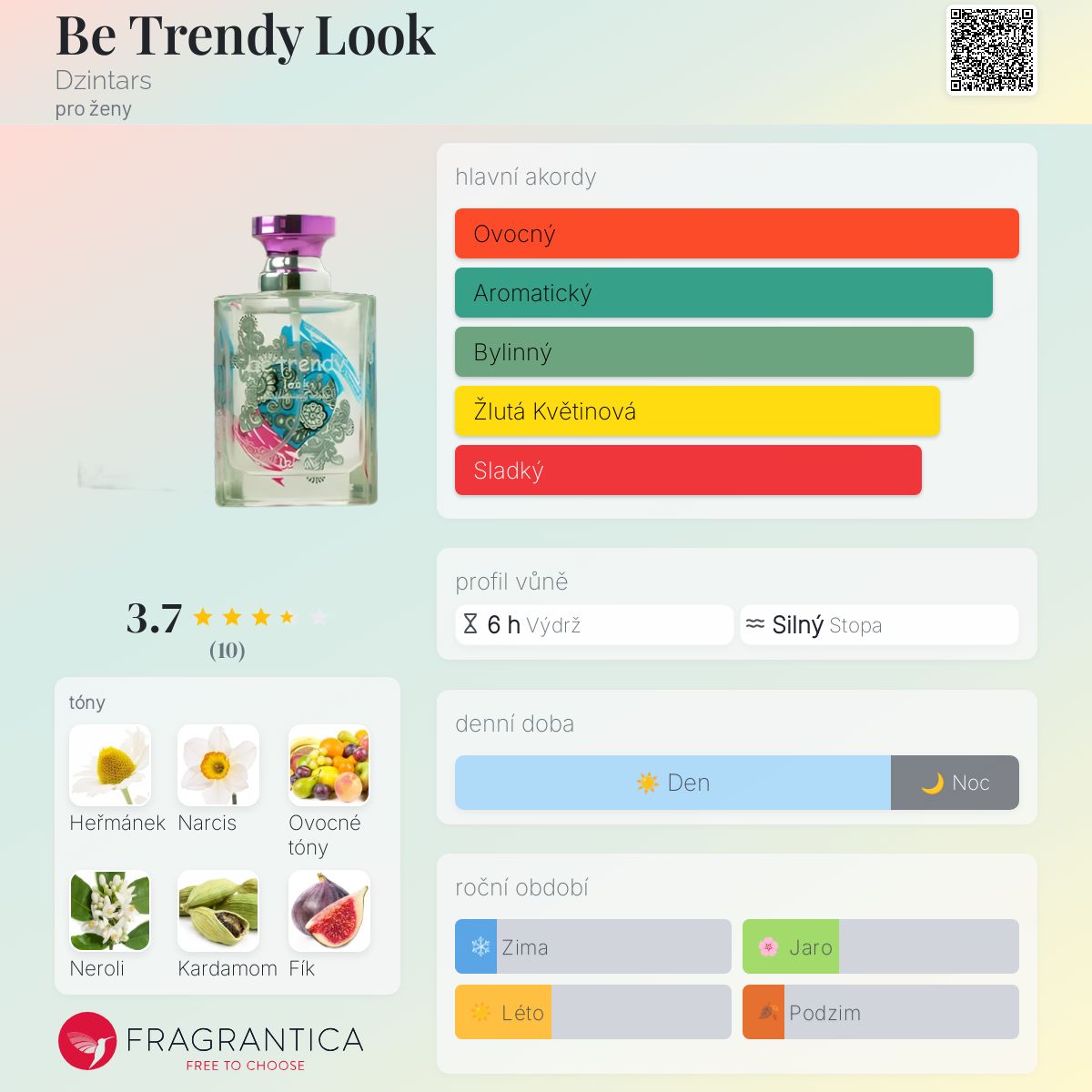 Be Trendy Look podle Dzintars je Floral Fruity vůně pro ženy. Be Trendy Look byl/a uveden/a v roce 2011. Vrchní tóny jsou Heřmánek, Fík, Nektarinka a Citrón; střední tóny jsouNarcis, Exotické ovoce, Neroli a Bergamot ; základní tóny jsou Kardamom, Jantar (ambra) a Palisandr.