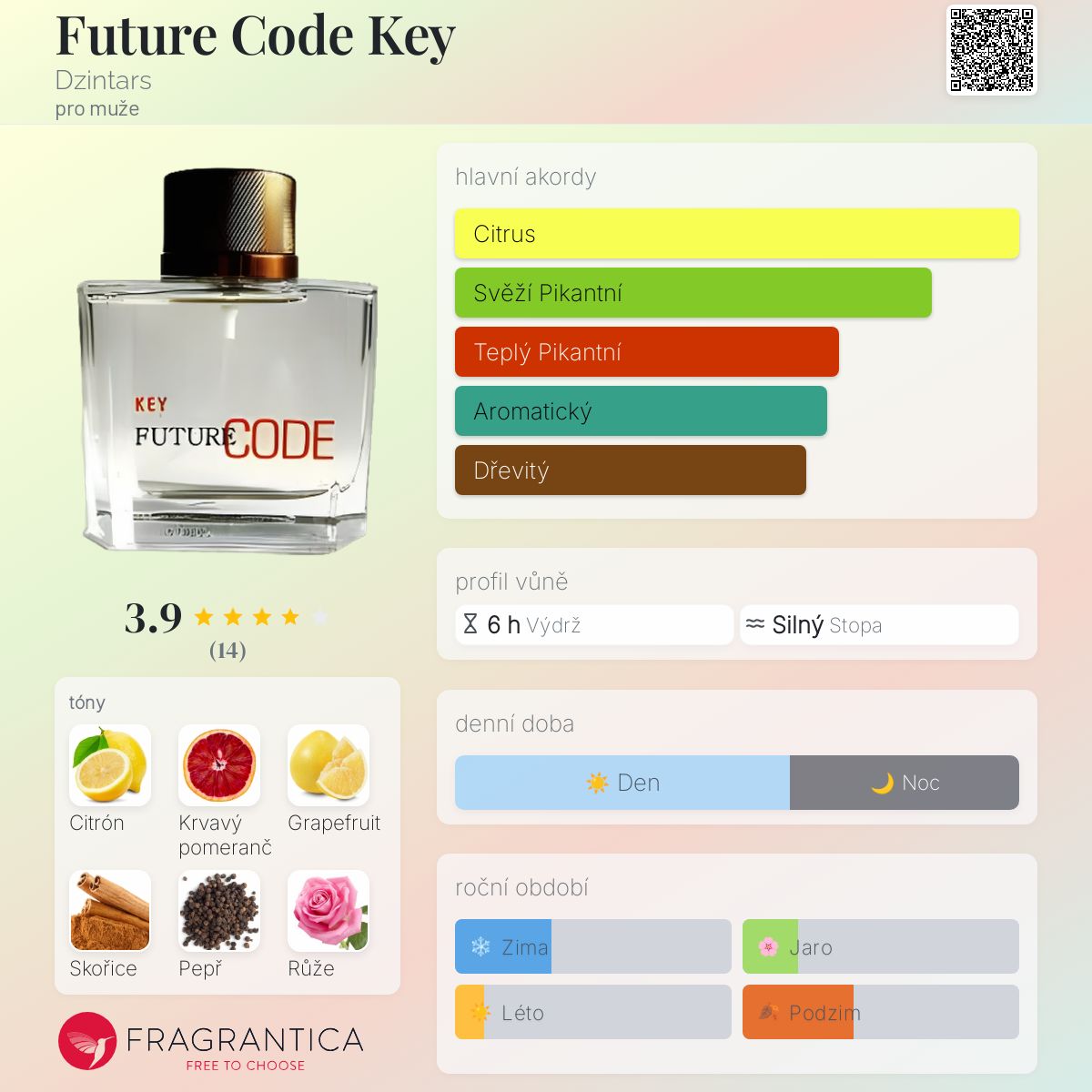 Future Code Key podle Dzintars je Aromatic Spicy vůně pro muže. Future Code Key byl/a uveden/a v roce 2011. Vrchní tóny jsou Citrón, Krvavý pomeranč a Grapefruit; střední tóny jsouSkořice, Bílý pepř, Růže a Pikantní máta ; základní tóny jsou Jantar (ambra), Cedr, Pačuli, Santalové dřevo a Kůže.