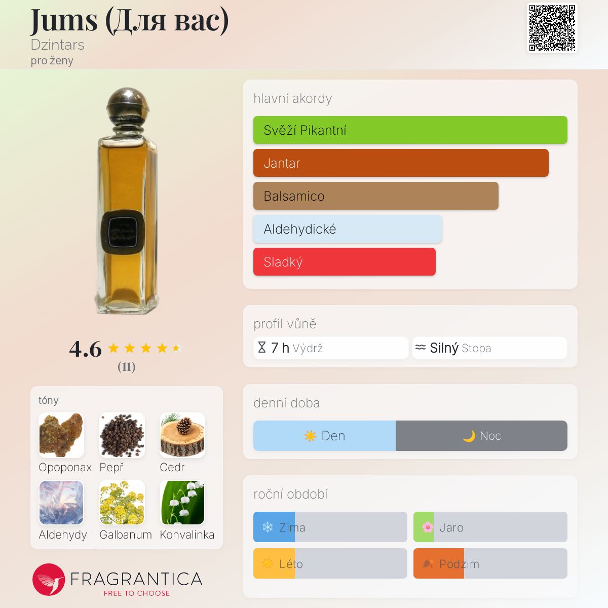 Jums (Для вас) podle Dzintars je Floral Aldehyde vůně pro ženy. Jums (Для вас) byl/a uveden/a v roce 1981. Jums (Для вас) byl/a vytvořen/a Antonina Vitkovskaya, Victoria Ryabko a Liesma Oše (Prūse). Vrchní tóny jsou Cedr, Aldehydy a Konvalinka; střední tóny jsouGalbanum, Jasmín, Ylang-Ylang a Růže ; základní tóny jsou Opoponax, Černý pepř, Pižmo a Santalové dřevo.