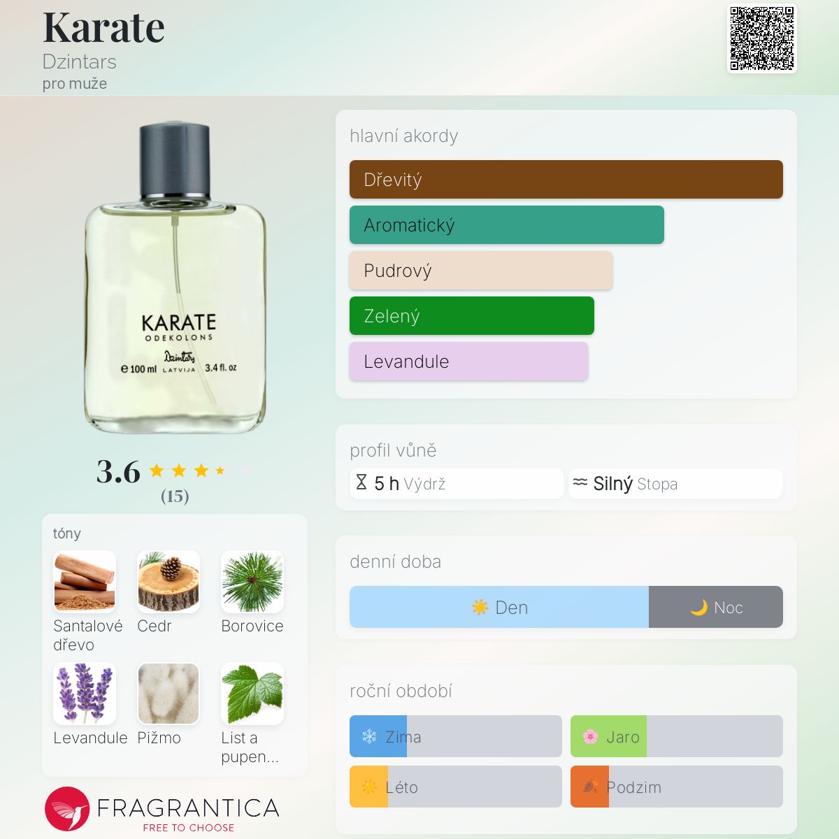 Karate podle Dzintars je vůně pro muže. Karate byl/a uveden/a v roce 2010. Vrchní tóny jsou Levandule, Černý rybíz a Máta; střední tóny jsouSantalové dřevo, Borovice a Bazalka ; základní tóny jsou Cedr, Pižmo a Dubový mech.