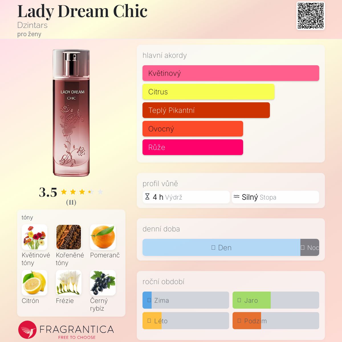 Lady Dream Chic podle Dzintars je Floral Woody Musk vůně pro ženy. Lady Dream Chic byl/a uveden/a v roce 2011. Vrchní tóny jsou Pomeranč, Citrón, Frézie a Černý rybíz; střední tóny jsouKvětinové tóny a Růže ; základní tóny jsou Kořeněné tóny, Pačuli a Pižmo.