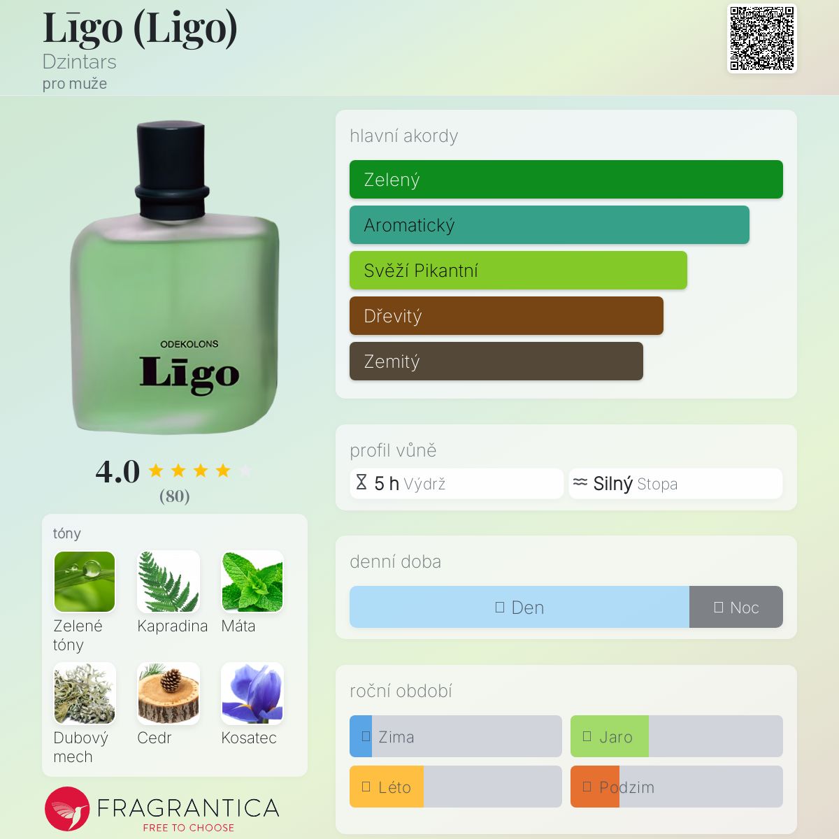 Līgo (Ligo) podle Dzintars je Citrus Aromatic vůně pro muže. Līgo (Ligo) byl/a uveden/a v roce 2000. Vrchní tóny jsou Bylinné tóny, Máta a Bergamot; střední tóny jsouKapradina, Kosatec a Santalové dřevo ; základní tóny jsou Dubový mech, Cedr a Balzám Tolu.