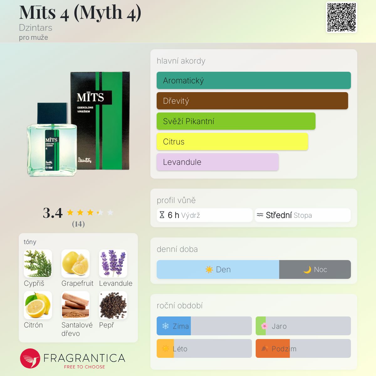 Mīts 4 (Myth 4) podle Dzintars je Aromatic Fougere vůně pro muže. Mīts 4 (Myth 4) byl/a uveden/a v roce 2010. Vrchní tóny jsou Grapefruit, Citrón a Pepř; střední tóny jsouCypřiš, Levandule a Vetiver ; základní tóny jsou Santalové dřevo, Jalovcové bobulky a Pižmo.