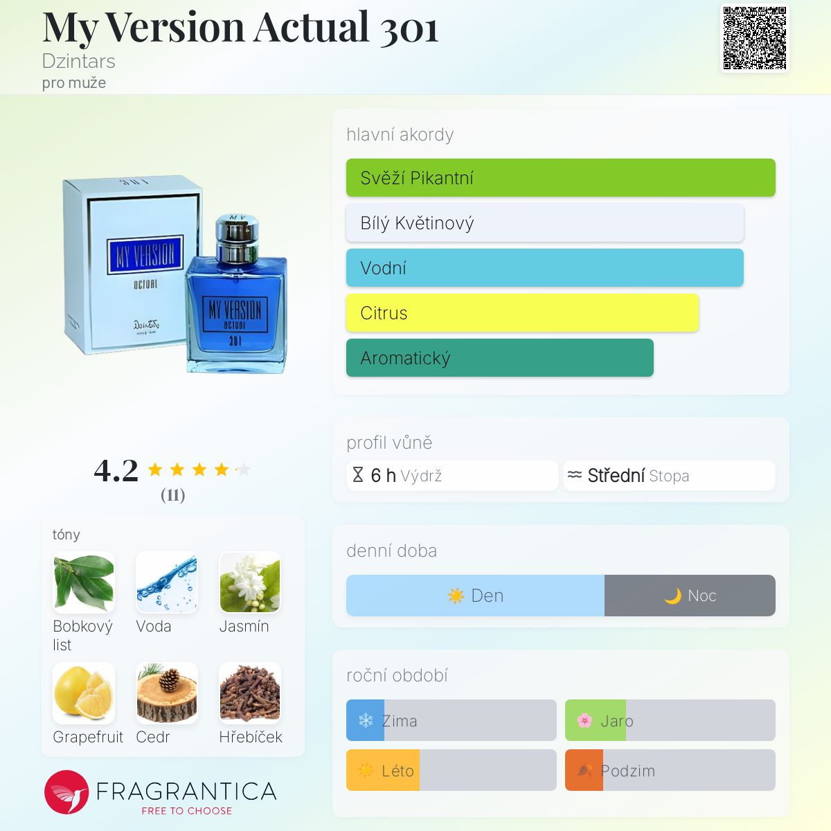 My Version Actual 301 podle Dzintars je Woody Spicy vůně pro muže. My Version Actual 301 byl/a uveden/a v roce 2014. Vrchní tóny jsou Bobkový list, Vodnaté tóny a Grapefruit; střední tóny jsouJasmín, Cedr a Hřebíček ; základní tóny jsou Pačuli, Jantar (ambra) a Dubový mech.