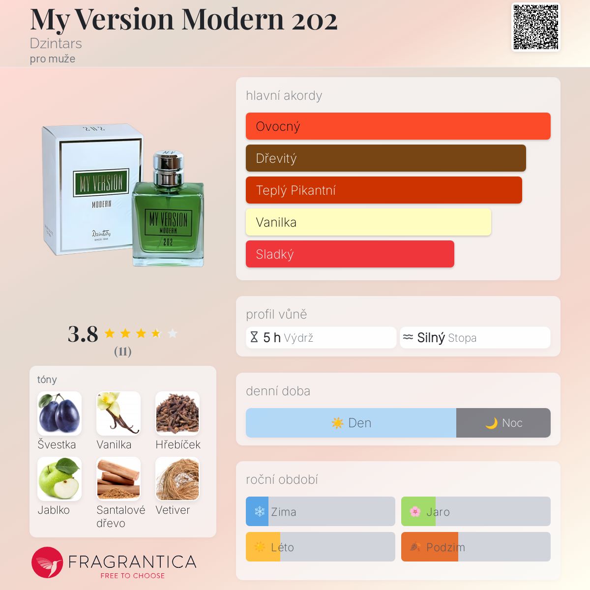 My Version Modern 202 podle Dzintars je Orientální Woody vůně pro muže. My Version Modern 202 byl/a uveden/a v roce 2014. Vrchní tóny jsou Švestka, Jablko a Citrusy; střední tóny jsouHřebíček, Pelargónie a Skořice ; základní tóny jsou Vanilka, Santalové dřevo, Vetiver a Cedr.