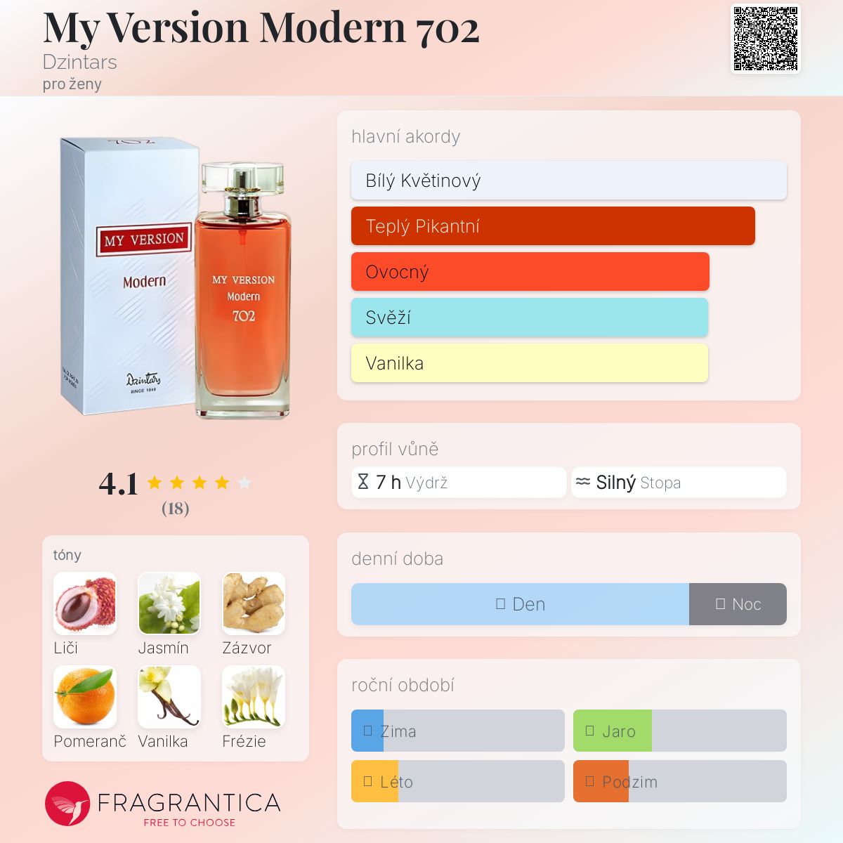 My Version Modern 702 podle Dzintars je Orientální Floral vůně pro ženy. My Version Modern 702 byl/a uveden/a v roce 2014. Vrchní tóny jsou Liči, Pomeranč, Hruška a Růžový pepř; střední tóny jsouJasmín, Frézie, Lilie, Med a Agarové dřevo (oud) ; základní tóny jsou Zázvor, Vanilka, Fazole tonka, Hřebíček a Jantar (ambra).