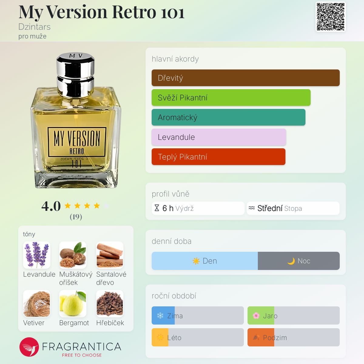 My Version Retro 101 podle Dzintars je Orientální Woody vůně pro muže. My Version Retro 101 byl/a uveden/a v roce 2014. Vrchní tóny jsou Levandule, Muškátový oříšek, Bergamot a Citrón; střední tóny jsouHřebíček, Cedr a Pačuli ; základní tóny jsou Santalové dřevo, Vetiver, Pižmo a Fazole tonka.