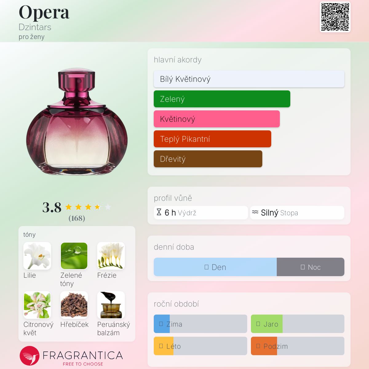 Opera podle Dzintars je Floral Woody Musk vůně pro ženy. Opera byl/a uveden/a v roce 2012. Vrchní tóny jsou Zelené tóny a Citronový květ; střední tóny jsouLilie, Frézie a Jasmín ; základní tóny jsou Hřebíček, Peruánský balzám, Santalové dřevo a Pižmo.