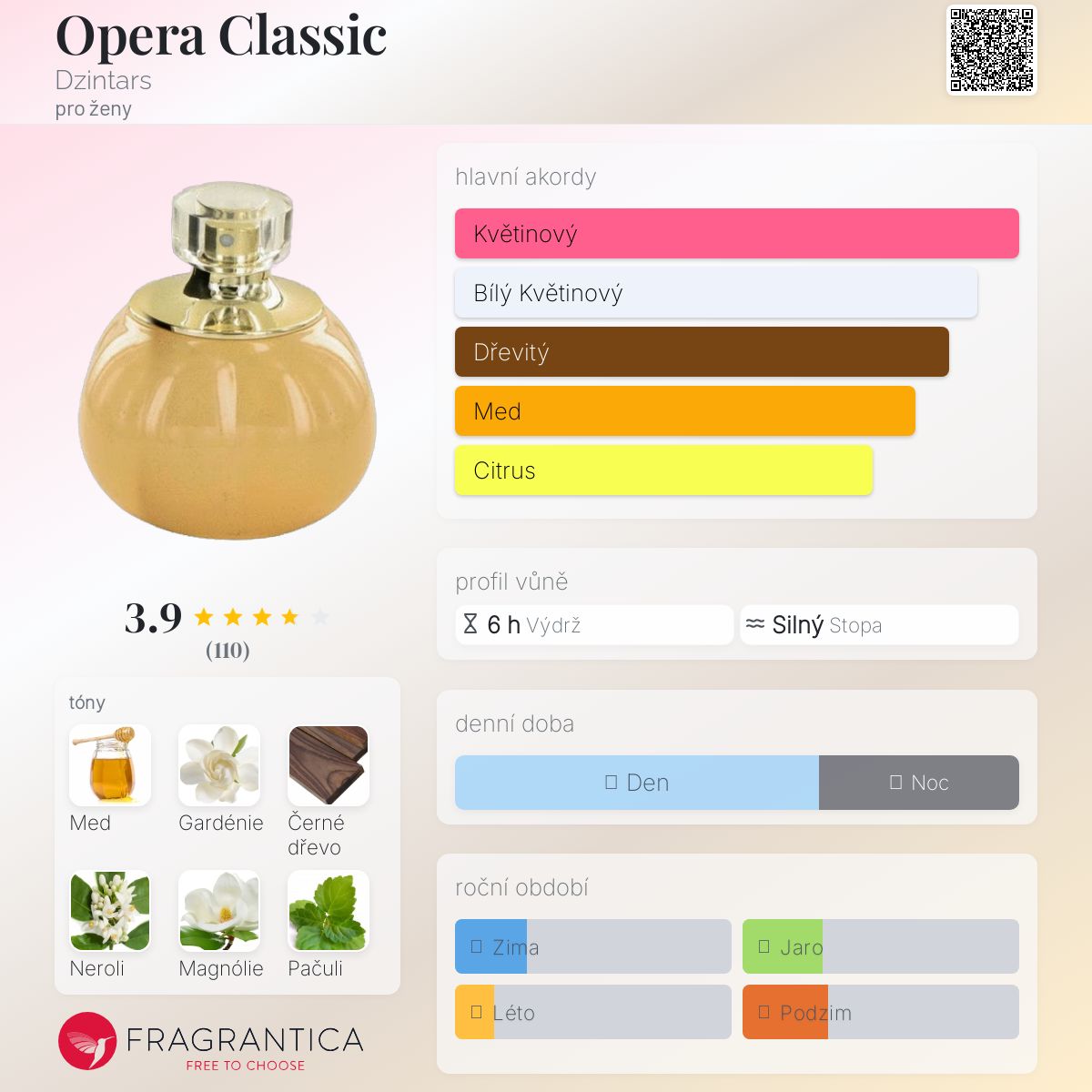 Opera Classic podle Dzintars je Floral Fruity Gourmand vůně pro ženy. Opera Classic byl/a uveden/a v roce 2013. Vrchní tóny jsou Neroli, Pomeranč a Červené bobule; střední tóny jsouGardénie, Magnólie a Růžová pivoňka ; základní tóny jsou Med, Černé dřevo a Pačuli.