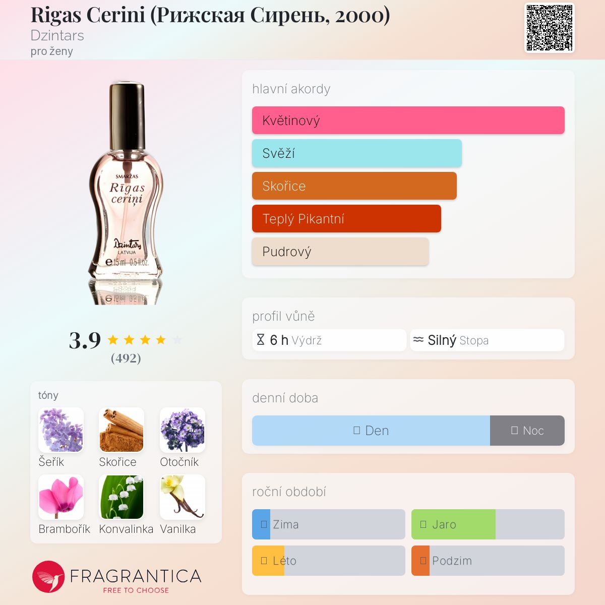 Rigas Cerini (Рижская Сирень, 2000) podle Dzintars je Floral vůně pro ženy. Rigas Cerini (Рижская Сирень, 2000) byl/a uveden/a v roce 2000. "Nosem" za touto vůní je Artyushkova M.L.. Vrchní tóny jsou Šeřík, Brambořík a Konvalinka; střední tóny jsouSkořice, Otočník a Vanilka ; základní tóny jsou Jantar (ambra) a Pižmo.