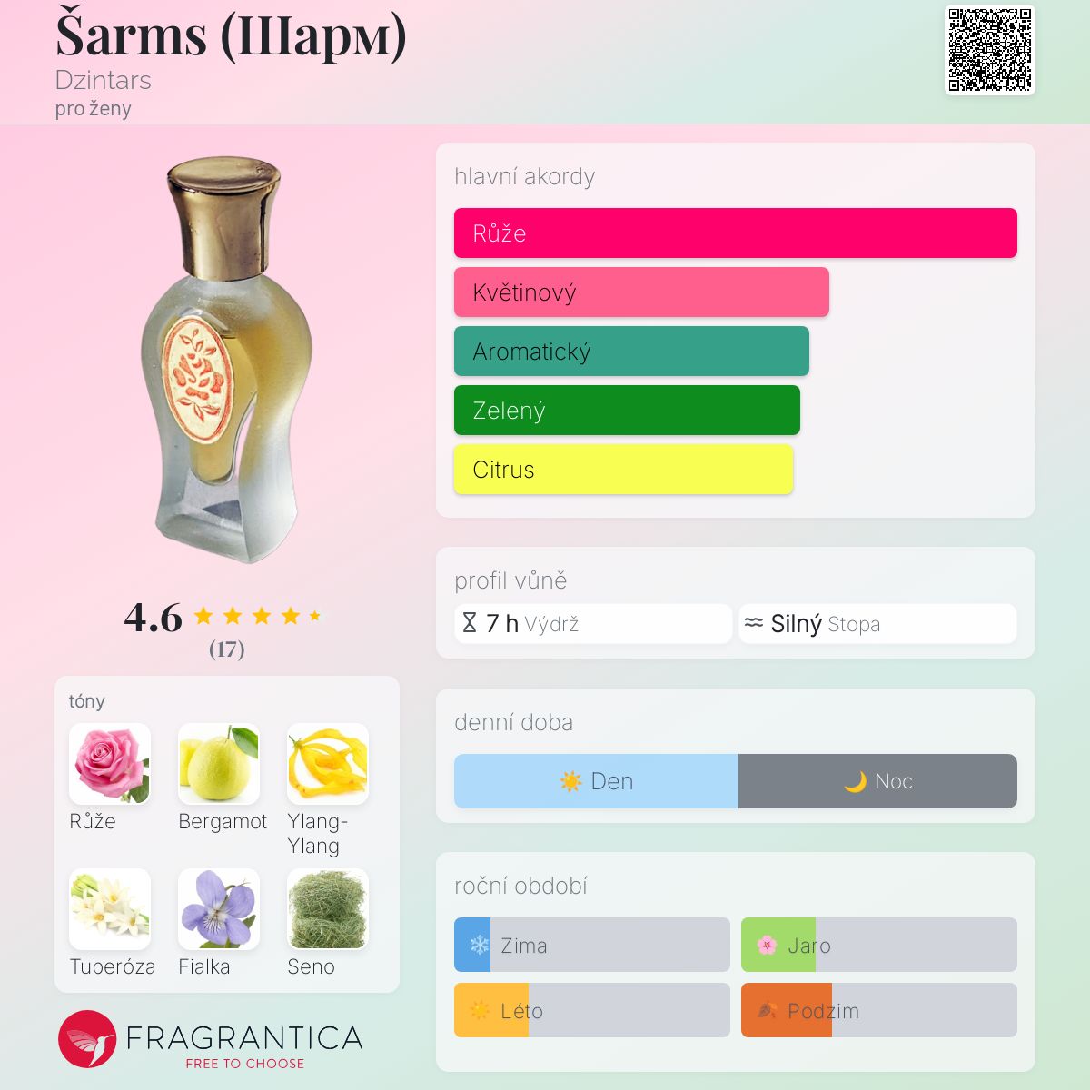 Šarms (Шарм) podle Dzintars je Floral Woody Musk vůně pro ženy. Šarms (Шарм) byl/a uveden/a v roce 1972. "Nosem" za touto vůní je Bronislava Schwarzman. Vrchní tóny jsou Bergamot, Tuberóza, Fialka a Seno; střední tóny jsouRůže, Ylang-Ylang, Vetiver, Šalvěj muškátová a Jasmín ; základní tóny jsou Galbanum, Pižmo a Syntetická cibetka.